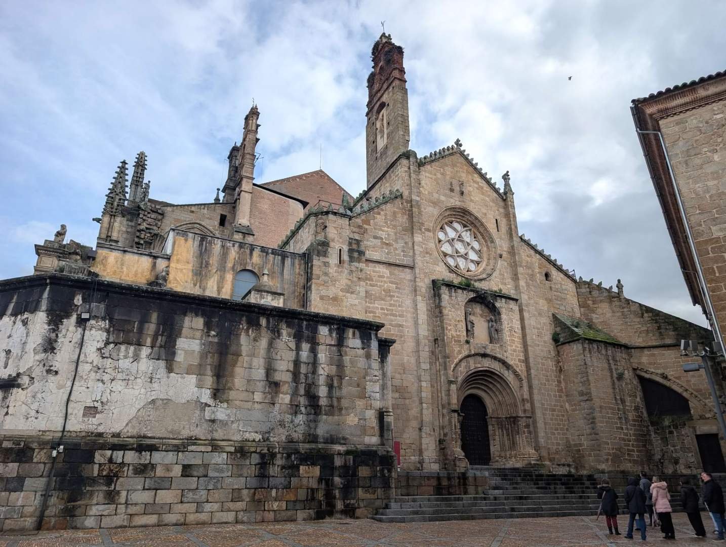 We continued towards the cathedrals, because in Plasencia they didn't settle for one. There is the Old Cathedral, Romanesque and Gothic, more sober and collected, and the New Cathedral, Renaissance, huge and ambitious, which was built without ever finishing completely. The two are stuck together, as if they got along well despite the centuries. We didn't go in because it's paid and I couldn't go in, and leaving me outside while Edu soaked up history didn't seem like a good plan. So we enjoyed them from the outside, which isn't bad either.