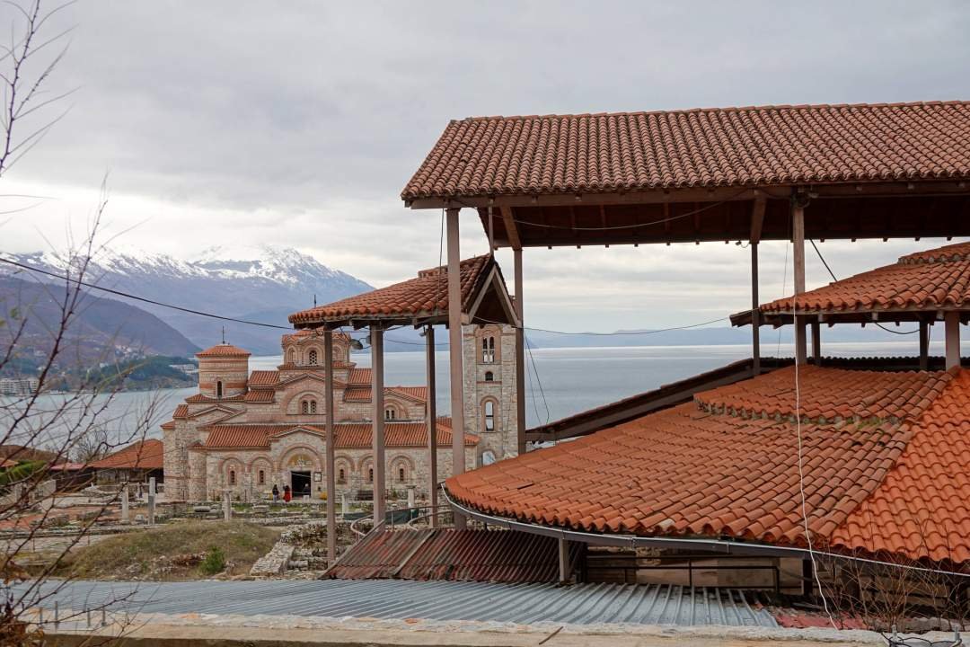 Tras mil fotos, selfies y un par de vídeos, subimos por otro camino, esta vez atravesando un bosque. Allí encontramos el monasterio de San Panteleimon y el sitio arqueológico de la antigua ciudad de Ohrid. Es una pasada ver cómo se mezclan las ruinas con las iglesias ortodoxas modernas. Ah, y lo curioso: ¡una iglesia que parecía más un cobertizo! Solo tenía un techo sostenido por palos, pero sin paredes. ¿Quizás sea un lugar de oración al aire libre? Misterio sin resolver.