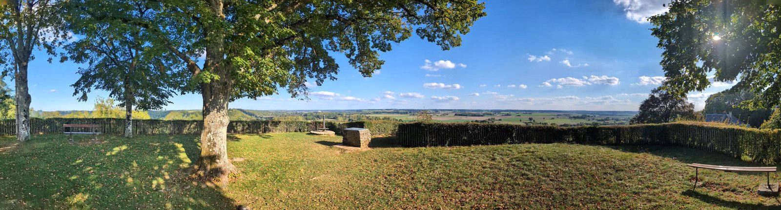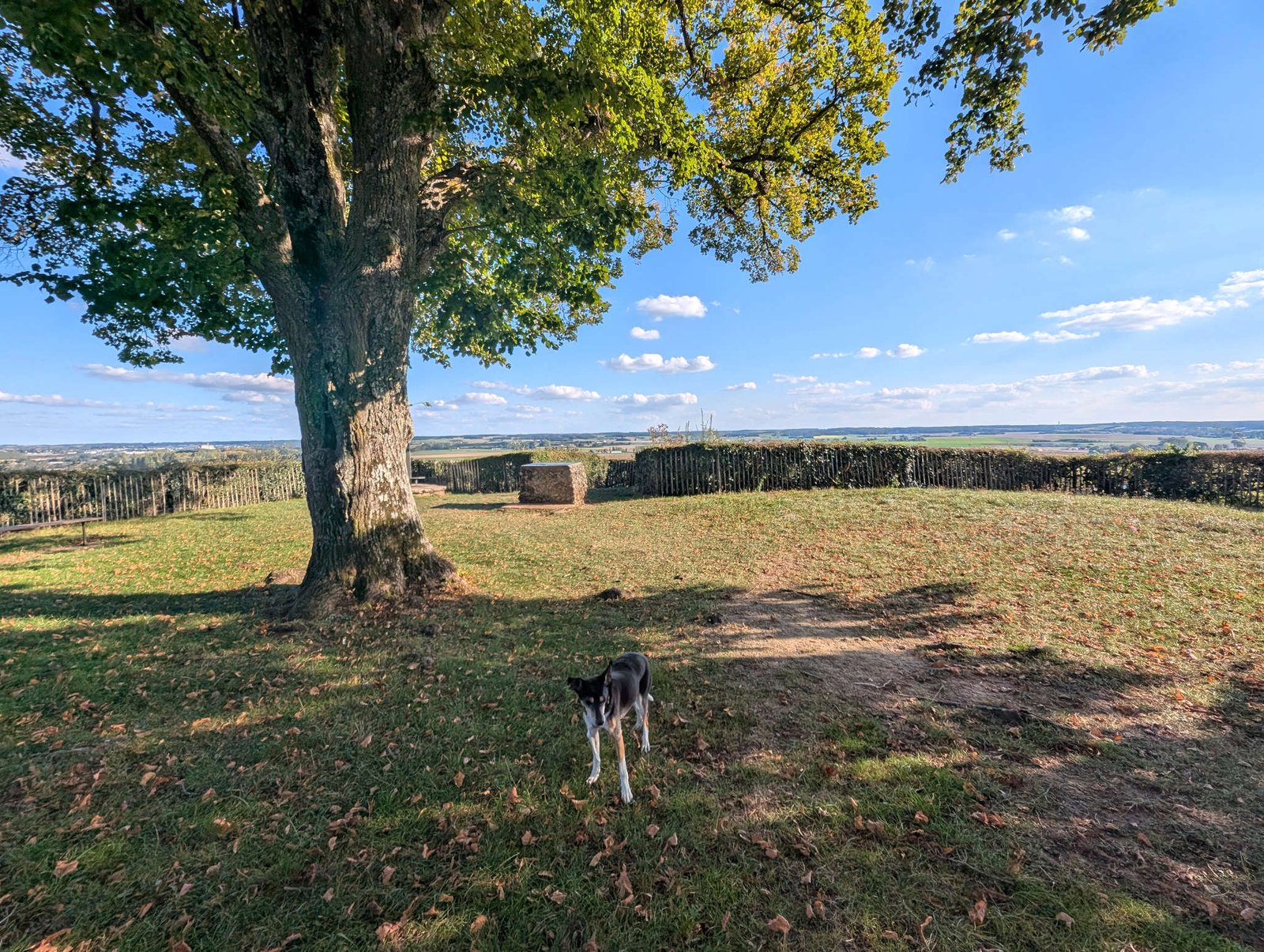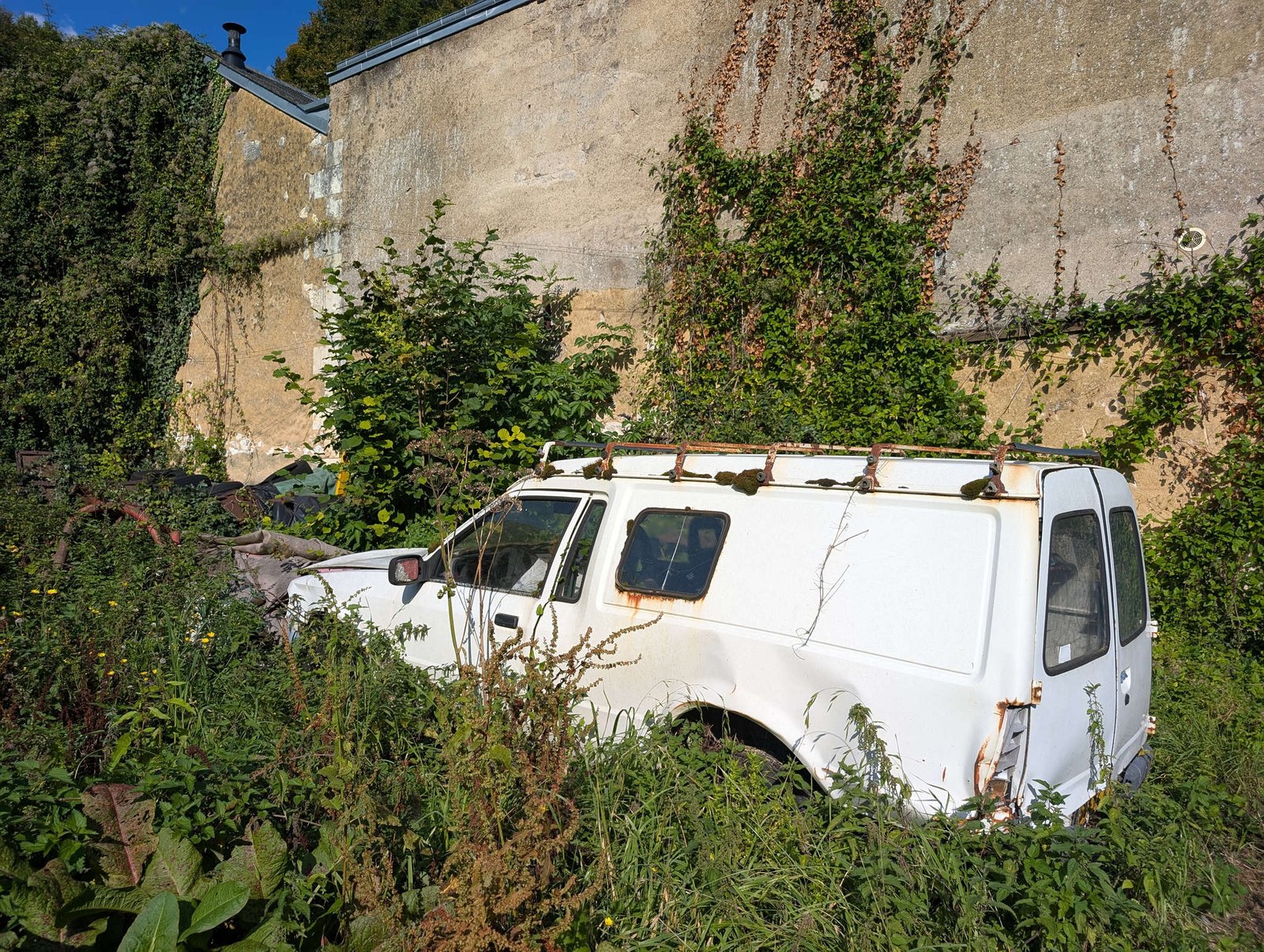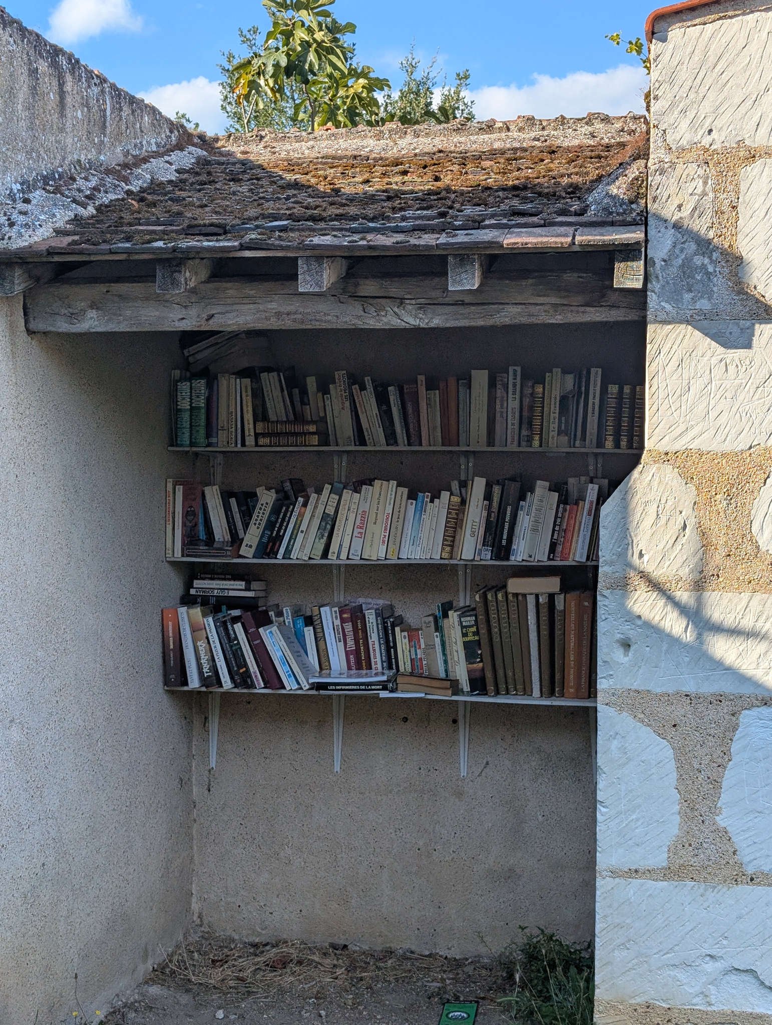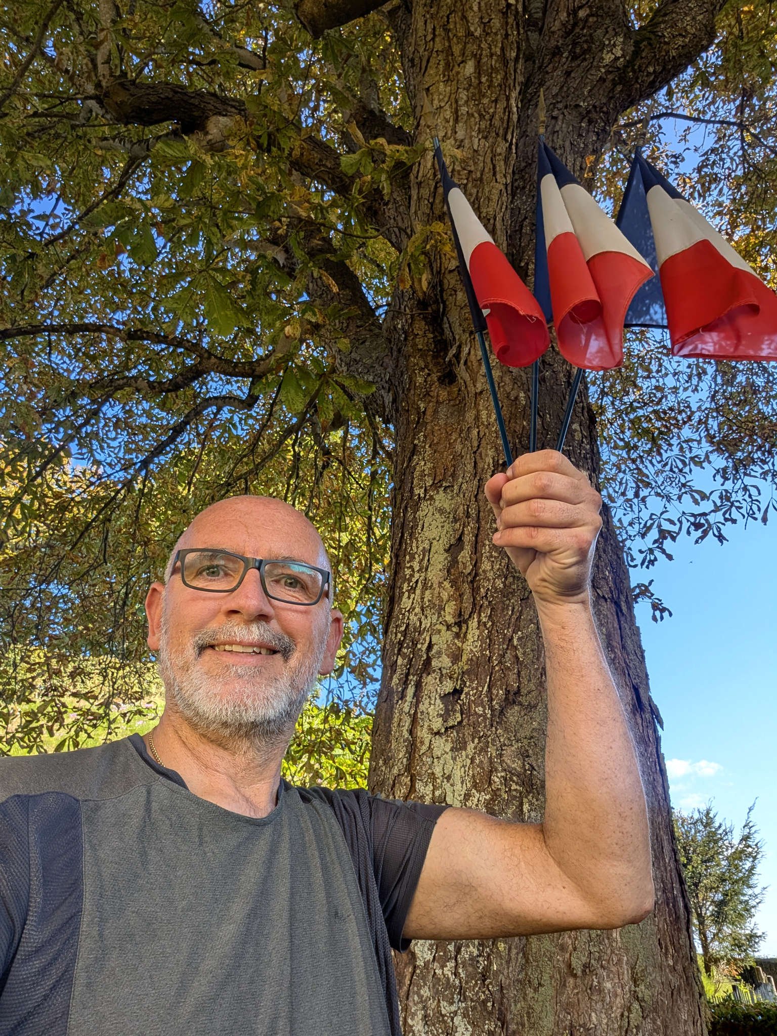 Nos instalamos y al poco pasó un hombre en coche blanco. Se paró, habló con papi en francés, súper amable, y nos dijo que no había problema en pasar la noche allí. Y que si alguien preguntaba, mencionáramos “el del coche blanco” como salvoconducto oficial. Así que aquí estamos, en silencio total, techo sin bellotas y sensación de pueblo fantasma pero amable.