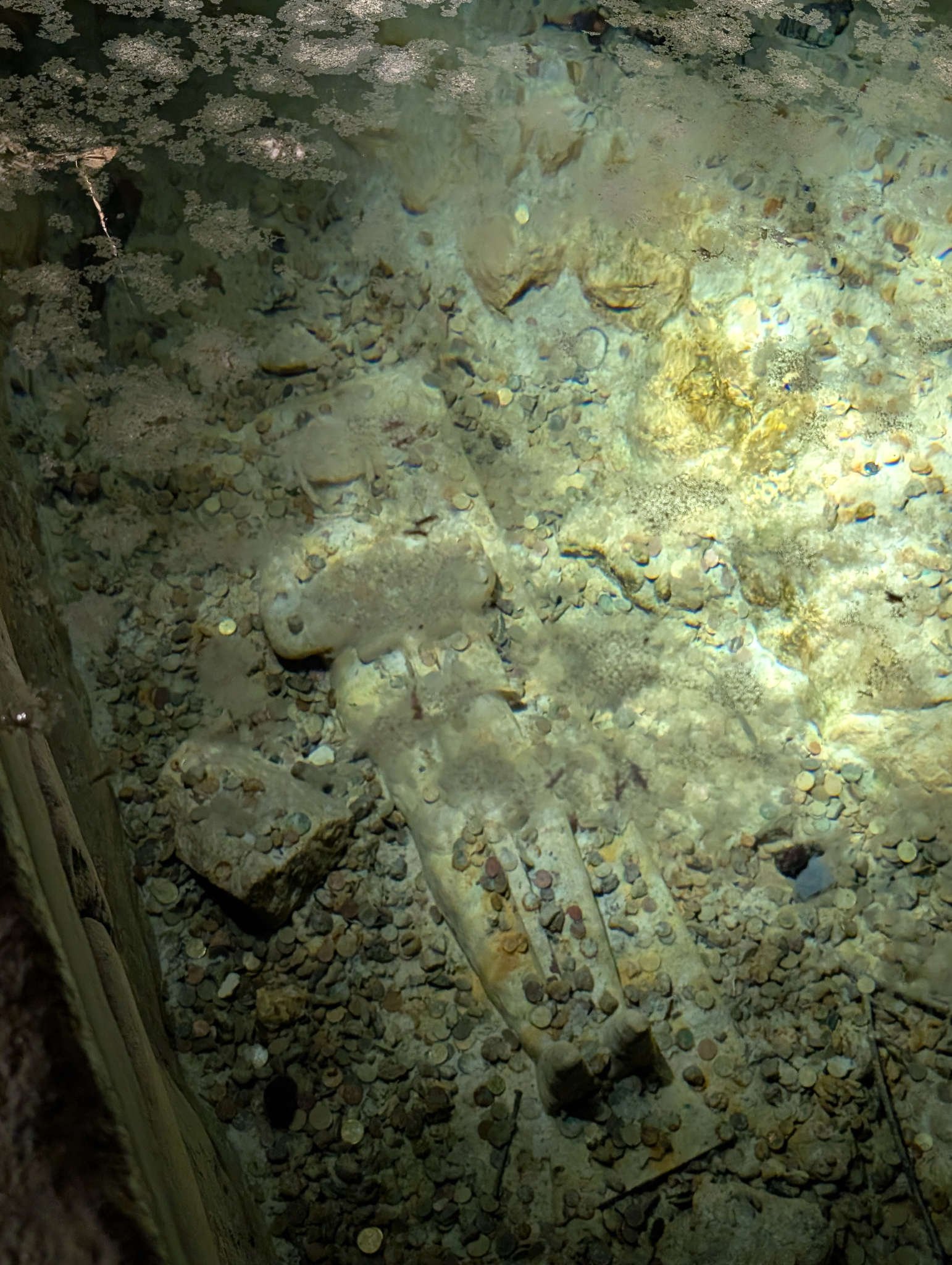 Luego bajamos a una cueva con fuente, más bien una cisterna natural en forma de pozo escondido bajo roca. Al fondo hay una especie de estatua o lápida vigilando, como guardián acuático de otro siglo. El agua es tan clara que parece vidrio, y la gente lanza monedas que flotan como si estuvieran suspendidas en el aire. Yo me asomé y casi me caí dentro intentando entender dónde empieza lo mojado.