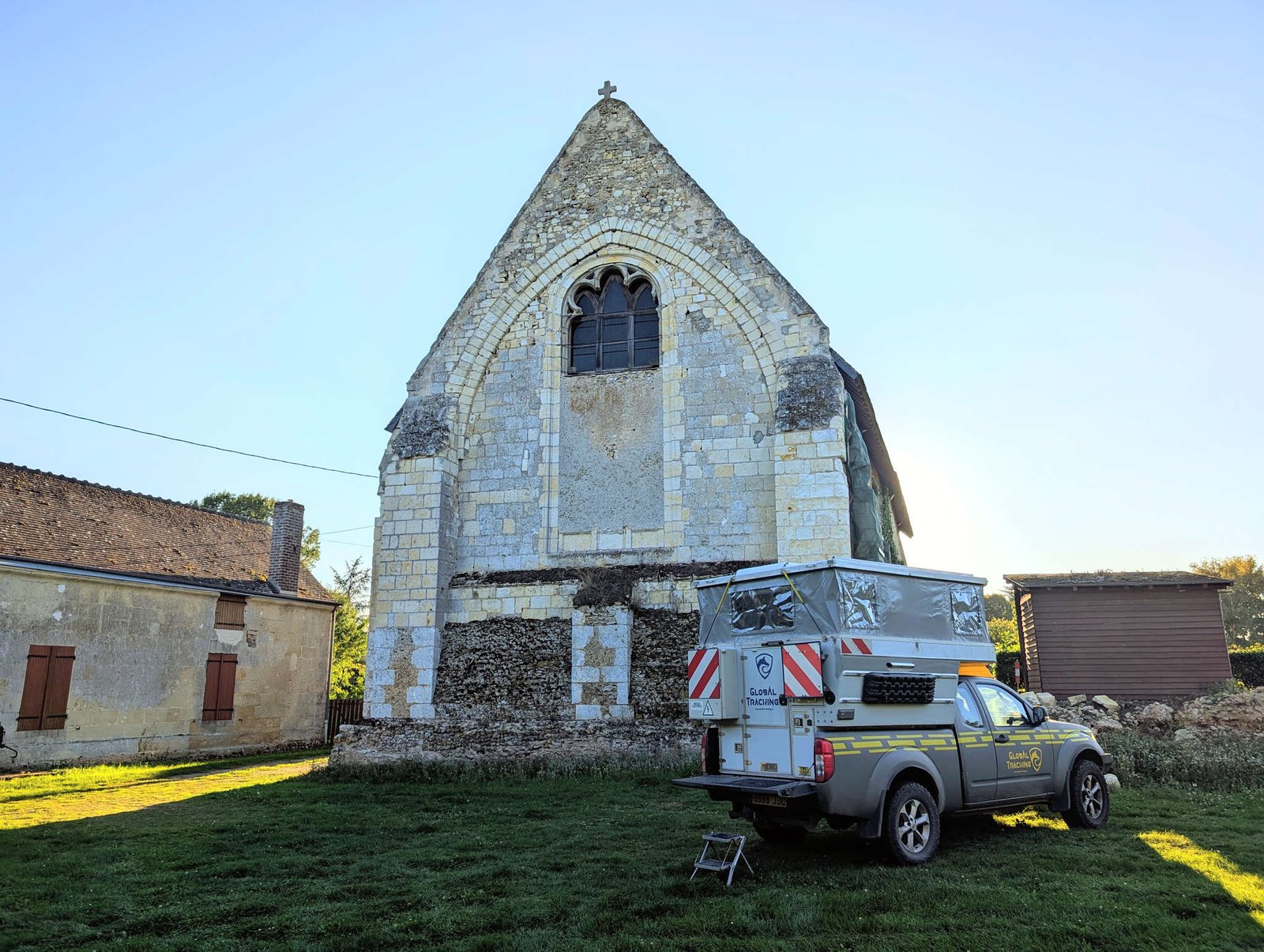 Cuando ya el sol empezaba a bajar, nos fuimos a buscar sitio para dormir. A menos de diez minutos encontramos gracias a Park4Night un rincón curioso detrás de una iglesia cerrada en una aldea minúscula. Y por milagro, llegamos aún con luz del día, no casi a oscuras como siempre.