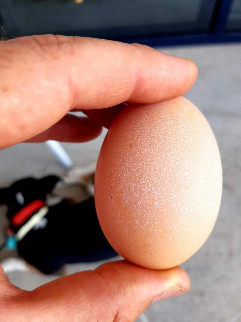 Cuando dejamos el valle, hicimos una paradita delante de un restaurante. Papi quería desayunar, pero estaba cerrado. Por suerte, apareció el dueño, un señor majo que se puso a charlar con papi. Antes de irse, nos regaló un huevo enorme, recién salido del horno... bueno, del trasero de una gallina. Calentito estaba. Pero, entre nosotros, sigo sin entender cómo algo tan rico puede salir de un pájaro tan feo. Aunque da igual, porque nunca lo sabremos: el huevo no sobrevivió al viaje en la mochila. Una pena, pero bueno.