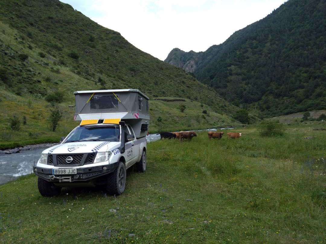 Mientras disfrutábamos del almuerzo, llegó la autocaravana de nuestros nuevos amigos alemanes, Ingo y Elke, que habían logrado llegar a Shatili sin problemas. Son gente tan simpática que harían reír a un perro cascarrabias. También llegaron unos jóvenes suizos, Franziska y Daniel, que viajan en una furgoneta amarilla convertida en cámper. Nos invitaron a unirse a ellos y al resto de los viajeros para compartir una velada digna de ronroneos.