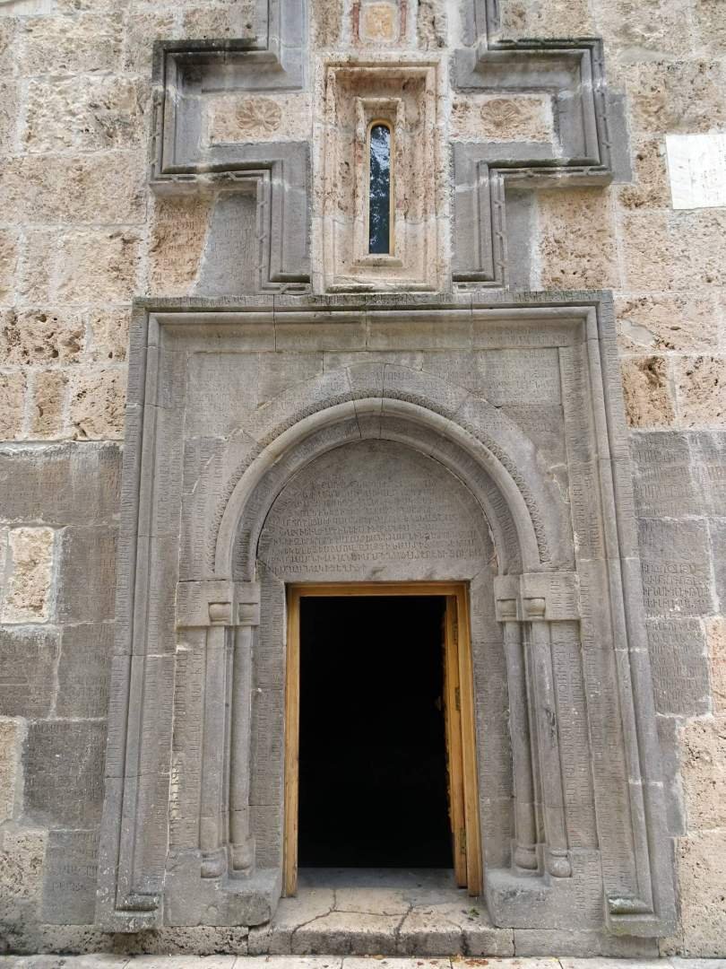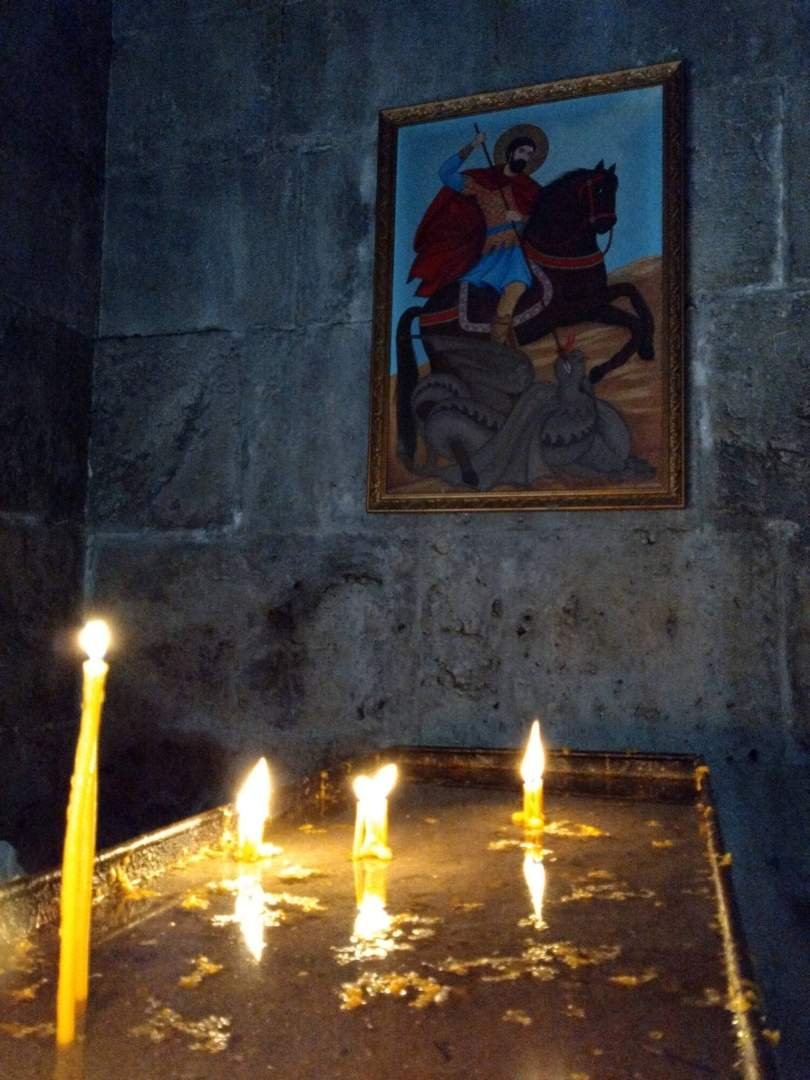 Por la mañana fuimos en coche al conjunto del monasterio de Haghartsin, que estaba a solo 20 minutos desde el sitio donde habíamos dormido. No se parece precisamente a un monasterio sino a un conjunto de unos 6 u 8 pequeñas iglesias o capillas. Está todo bastante restaurado pero estas iglesias ortodoxas no destacan por abundancia de decoración - son más bien oscuras y austeras. No tardamos mucho más que media hora para verlo todo y la verdad es que no nos impresionó demasiado. ¿Será que estamos ya un poco saturados de tantos monasterios? Vamos, el monumento soviético que está cerca del monasterio casi me gustó más.