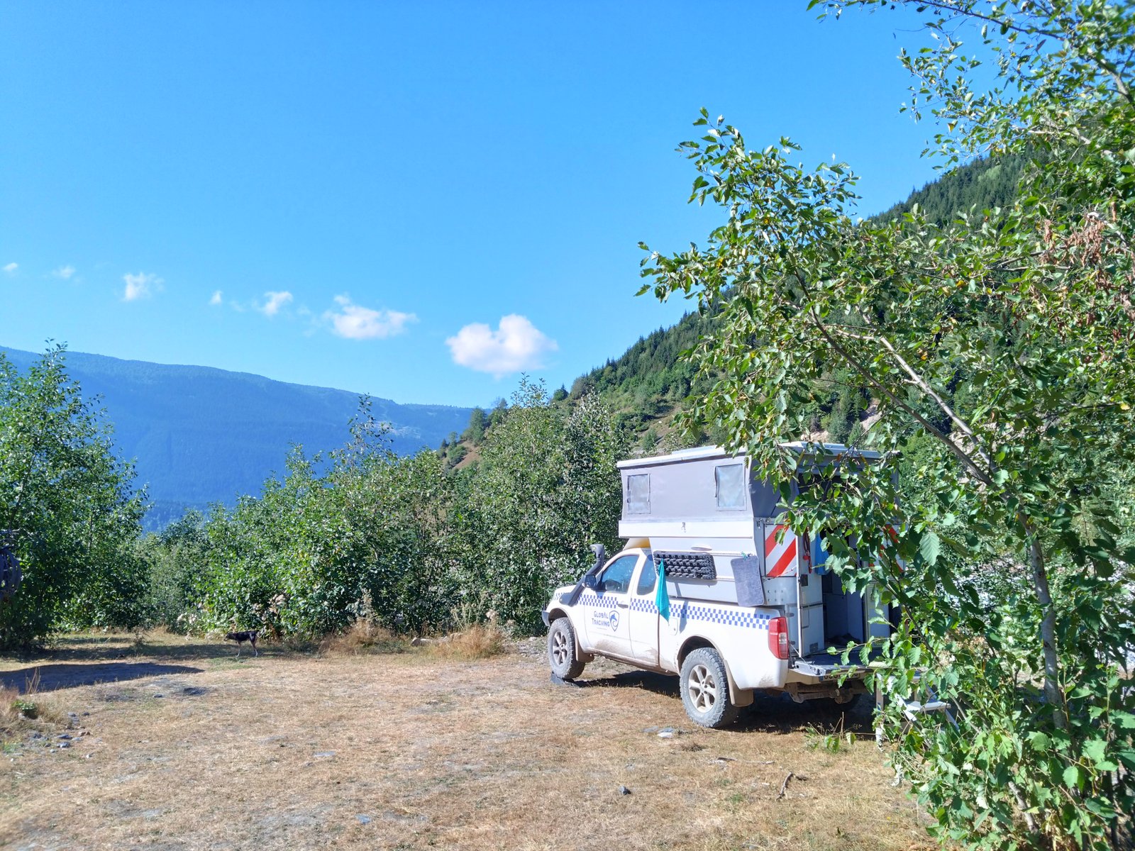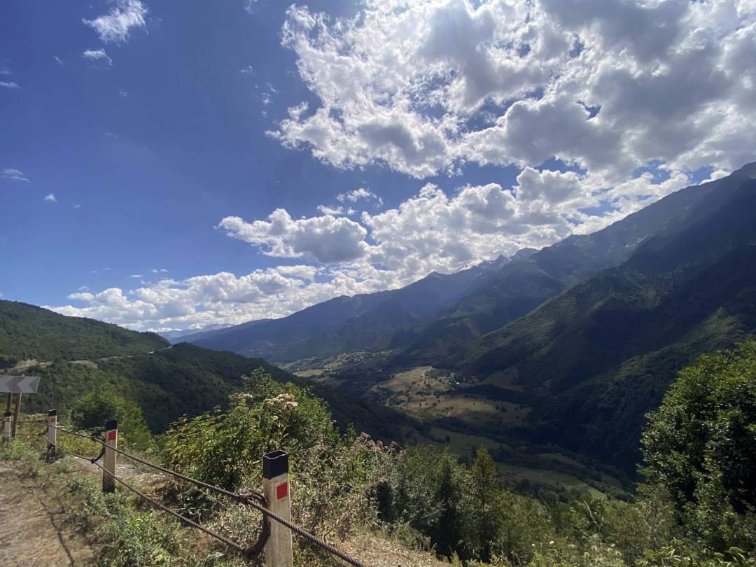 Luego seguimos subiendo en coche hasta que la carretera decidió que ya había hecho suficiente ejercicio y nos dejó a pie. El regreso en coche fue otro reto, ¡y vaya si lo fue! Mirad el vídeo que os he grabado, ¡no apto para los que temen a las alturas o a los "chuchos cagones" como yo! Definitivamente, no es una carretera para personas con vértigo ni para perritos que prefieren los paseos por la ciudad. Pero final-mente volvimos al mismo sitio donde habíamos comido. Y esta vez, con aún más cámperes alrededor, encontramos nuestro rincón entre los arbustos. Así que, supongo que esta noche vamos a dormir como "perros felices".