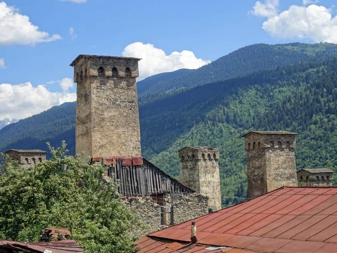 La carretera, con sus curvas y más curvas, nos hizo "cola" de tráfico en nuestras butacas. Y de repente nos encontramos un pueblo con esas casas-torre de los georgianos, ¡como si quisieran ser los "reyes" de sus propios castillos!