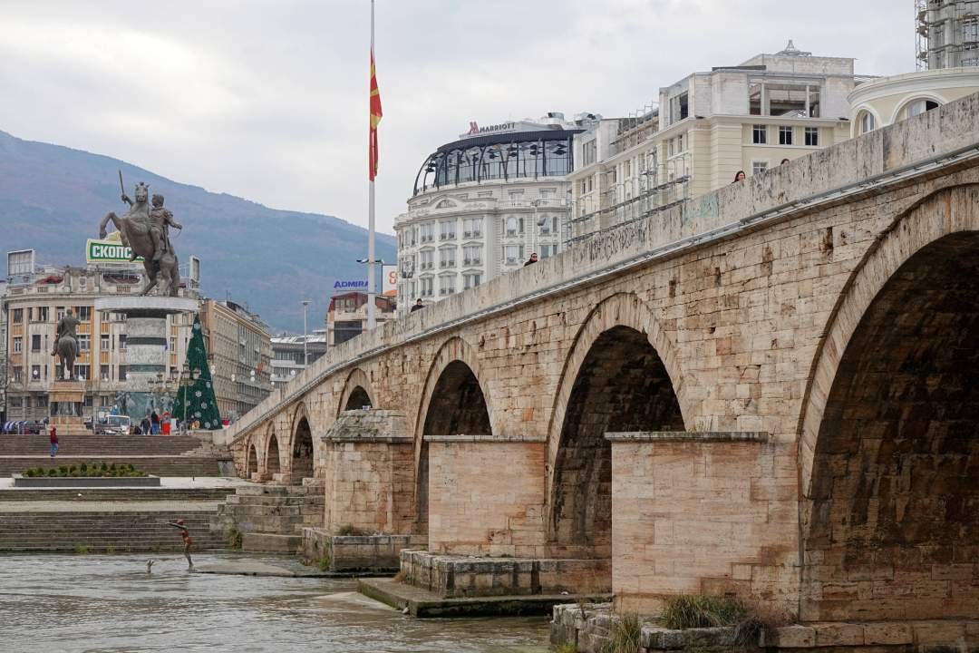 El paseo hacia el centro por el parque fue agradable, aunque las primeras impresiones de la ciudad no fueron muy prometedoras. Desde el coche ya habíamos notado que Skopje tenía una estética algo… peculiar. Pero todo cambió al llegar al famoso puente de piedra. Allí Skopje se reveló como un escenario grandioso, casi de cuento, pero de esos cuentos un poco raros donde mezclan épocas y estilos.