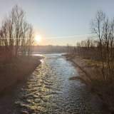 Cruzamos el puente y nos adentramos en un sendero entre árboles, oliendo rastros de otros perretes y bichos del bosque. Luego paseamos junto al río donde el agua brillaba con la luz de la tarde. Había algunos humanos pescando y otros pedaleando en bici.