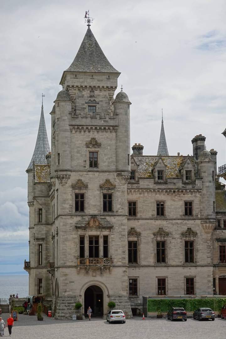 Nuestro primer destino fue el famosísimo Castillo de Dunrobin, que está entre Golspie y las nubes de cuento. Aparcamos como campeones en su parking, nos acercamos... y boom: ¡quince libras y media por barba para entrar! Y encima no admiten perros. ¡Excuse me! Un castillo que se llama Dunrobin y no deja entrar a un perro andaluz viajero, eso es como una empanadilla sin relleno. Así que dimos media vuelta elegantemente y cambiamos de plan.