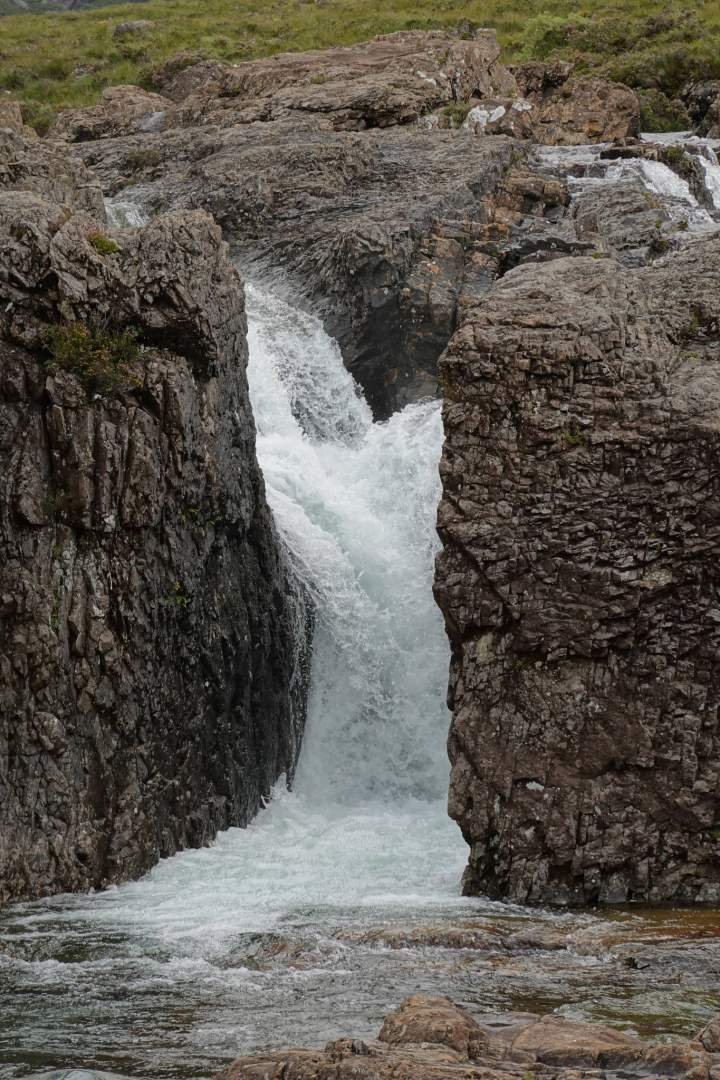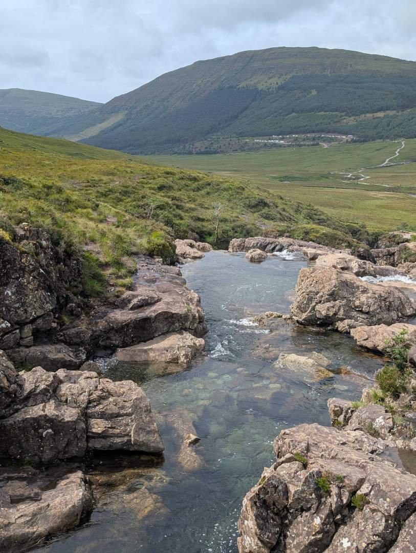 A las doce y media, sin mover el coche ni gastar una sola libra, caminamos desde nuestro aparcamiento hasta las famosas Fairy Pools. Diez minutos de paseo y llegamos. Las Fairy Pools son una serie de cascadas cristalinas y pozas naturales que bajan desde las montañas de Cuillin. Dicen que si te bañas allí, una hada escocesa te concede un deseo. Yo pedí croquetas de pato, ya veremos si funciona. Eso sí, ¡madre mía cuánta gente! Parecía que todas las hadas habían invitado a sus amigos y familiares. Subimos hasta lo que parecía el final del recorrido, hicimos fotos, selfies, y cuando ya estábamos saturados de turismo… ¡al coche volando!