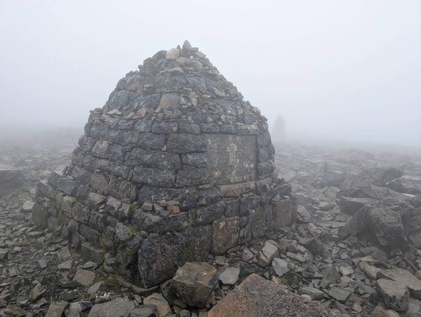 Aun así, hicimos cima en dos horas y cuarenta y cinco minutos. No está mal. Bueno, para humanos. Yo habría subido en una hora si no fuera por los bastonazos. Arriba no se veía absolutamente nada. Solo niebla, barro, más humanos chorreando y un montículo de piedras con un triángulo que, según dicen, marca la cumbre. Parecía una barbacoa abandonada. Todos se hacían selfies como si hubieran descubierto América. Nosotros también, claro. Foto rápida y salimos pitando.
