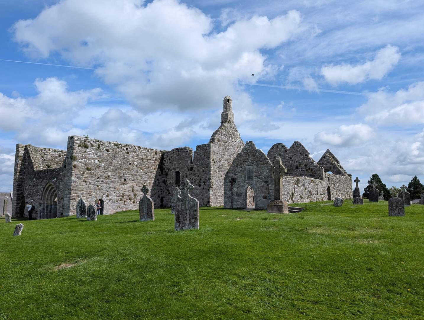 Luego coche —¡cómo no!— rumbo a Clonmacnoise, un lugar con nombre de conjuro mágico, pero que en realidad es un antiguo monasterio fundado en el siglo VI. Y qué lugar, oye. Unas ruinas espectaculares con cruces celtas gigantes, iglesias sin techo y torres redondas donde seguro vivían los fantasmas con eco. Lo mejor: a mí me dejaron pasar. Me porté como un monje ejemplar, oliendo todo sin hacer ruido y sin marcar ninguna tumba, que conste. Eso sí, había mucha gente. Parecía que habían puesto cerveza gratis detrás de una piedra sagrada.