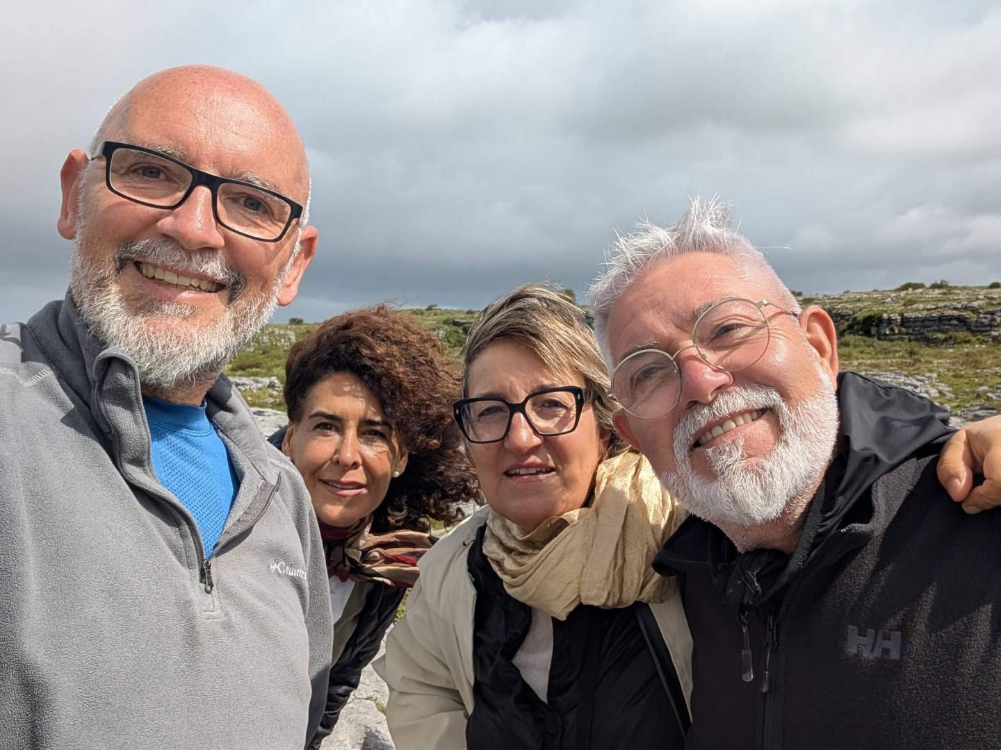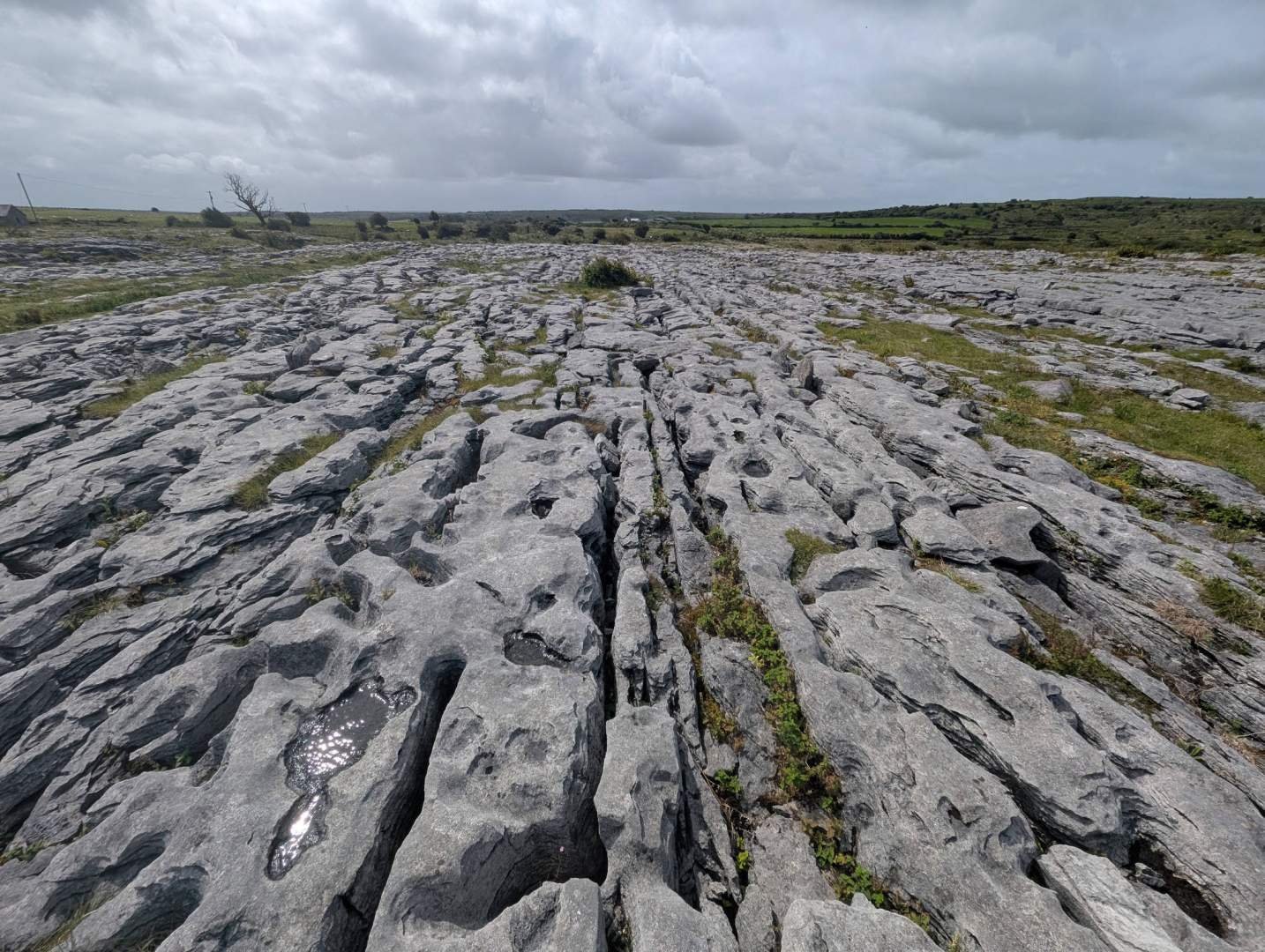 Sobre las once por fin salimos. Hoy tocaba explorar el sur de Galway, rumbo a tierras legendarias. Primera parada: Poulnabrone Dolmen. El nombre suena a piedra mágica capaz de invocar tormentas, pero en realidad es un dolmen prehistórico muy antiguo… y muy pequeño. O sea, sí, tiene más de seis mil años, pero como tumba colectiva impone lo justo. Lo que sí molaba era el paisaje: el Burren, una zona rocosa llena de grietas en el suelo, como si la tierra se hubiera resquebrajado de risa. Muy chulo para fotos, no tanto para correr. Yo metí una pata entre dos piedras y casi me convierto en fósil.