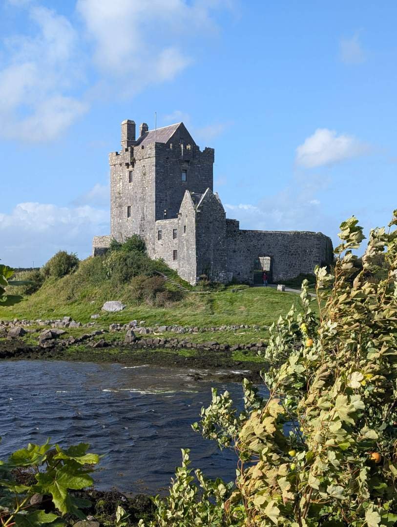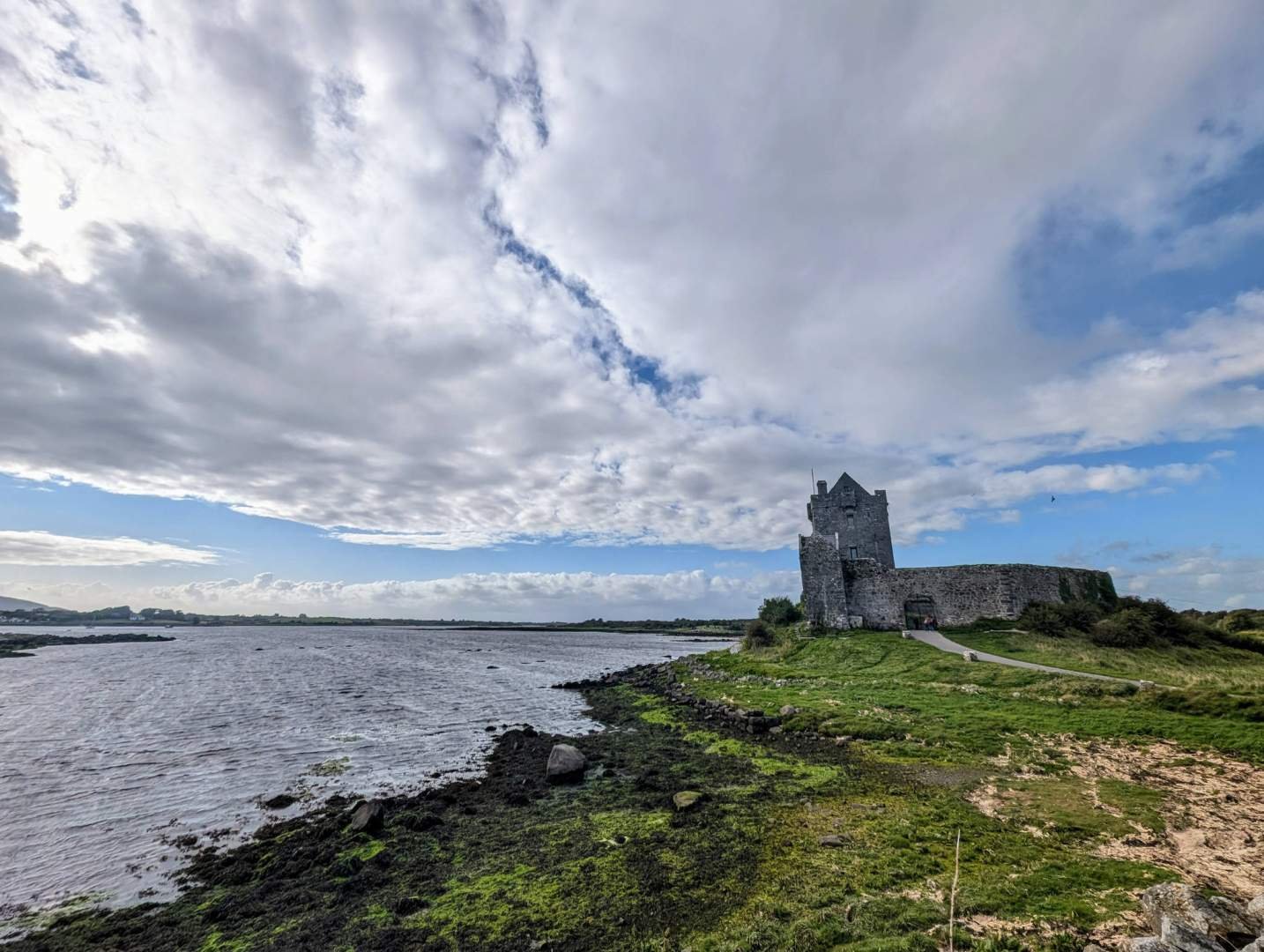 Después, coche otra vez, de vuelta a Galway. Pero no sin paradas estratégicas. Primero, en una gasolinera, para que papi Edu tomara café y no condujera con los ojos cerrados. Luego, breve visita a Dunguaire Castle, un castillo del siglo XVI que está justo al borde del agua, con un torreón muy fotogénico. No se puede entrar, pero desde fuera ya luce bastante majestuoso. Parecía de esos donde los caballeros discutían sobre quién había robado el último muslo de pollo.