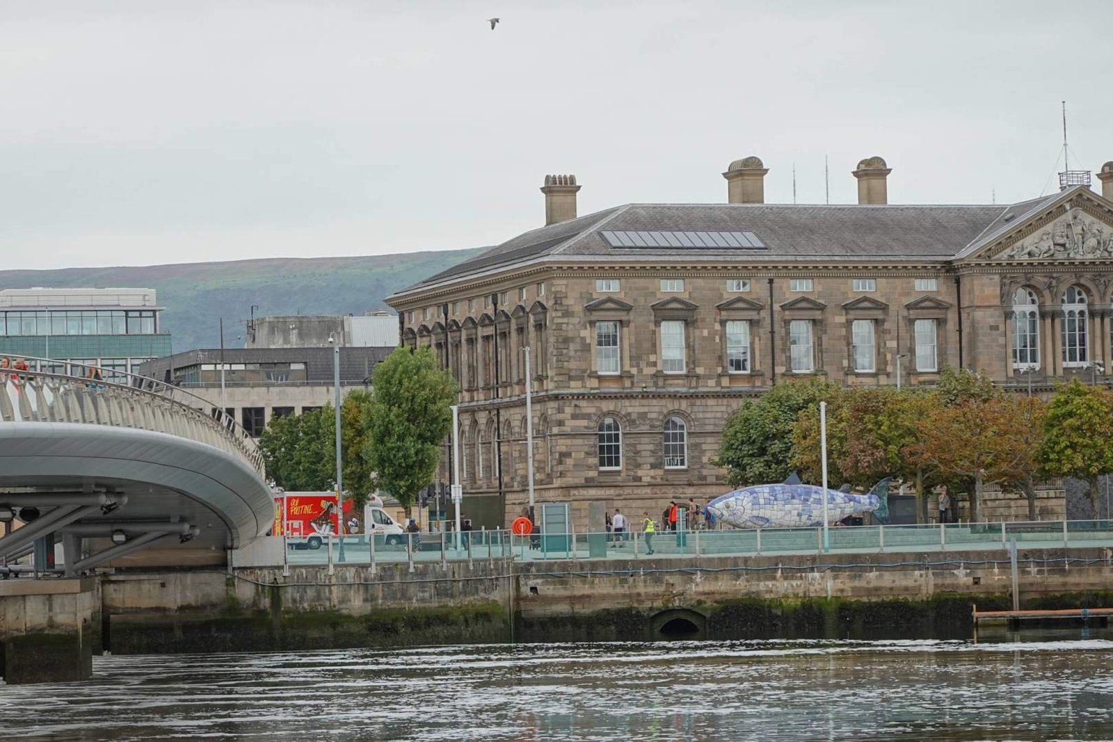 Nuestra ruta empezó en el Cathedral Quarter, el barrio más animado de Belfast. Calles adoquinadas, callejones estrechos llenos de bares decorados con guirnaldas de luces, murales de colores y ese bullicio que mezcla locales con turistas cámara en mano. Mereció la pena callejear sin rumbo, porque en cada esquina aparecía algo curioso: un pub histórico, una terraza abarrotada, un grafiti escondido. Entramos también en la catedral, imponente por fuera y acogedora por dentro. Y, antes de cruzar el puente sobre el río Lagan, nos topamos con “The Big Fish”, un enorme pez de cerámica azul cuyas escamas cuentan la historia de la ciudad.