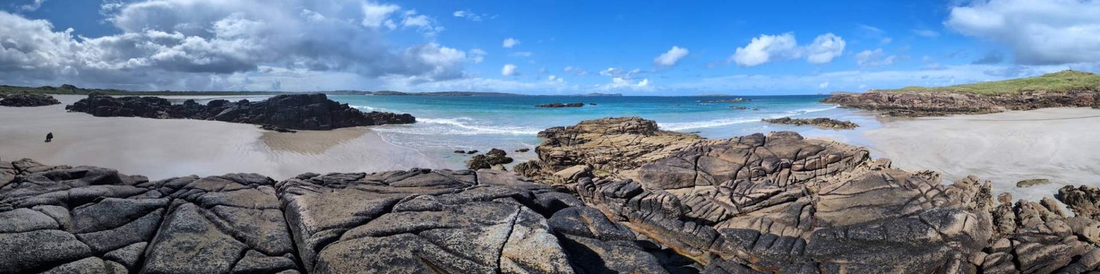 Después seguimos camino, pasando por el aeropuerto de Donegal. Yo me quedé mirando, a ver si de allí salían aviones llenos de perros rumbo a playas paradisíacas. Y hablando de playas, poco más adelante aparcamos detrás de una duna y apareció ante mis ojos un paraíso: arena lisa, tan perfecta que parecía peinada, y unas rocas enormes que salían como gigantes de piedra del mar. Yo me volví loco, corrí como un cohete y dejé huellas por todas partes. Eso sí, sin despeinar la arena demasiado, que estaba de exposición.