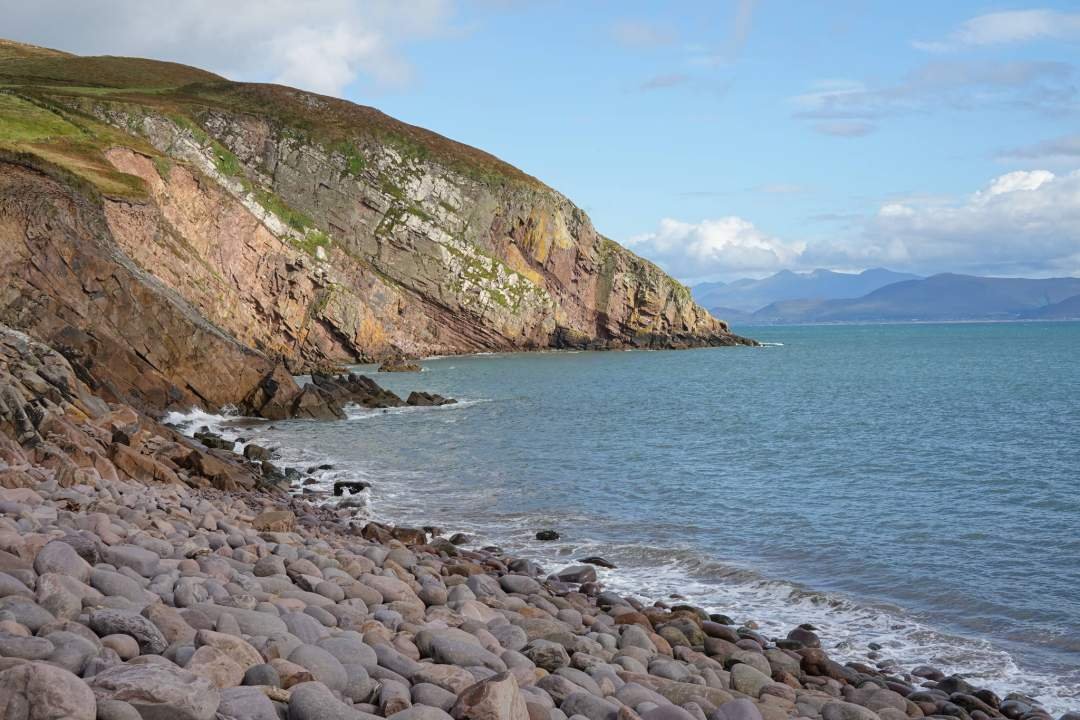 Finalmente llegamos a Clogher Strand. Y ahí sí. Aparcamiento con vistas espectaculares al mar, un viento más soportable, y tres o cuatro autocaravanas más repartidas por el lugar. Antes de recogernos, bajamos a la playa. No se permite bañarse —las corrientes son peligrosas— y el agua estaba tan fría que ni yo me habría atrevido a meter las patas.