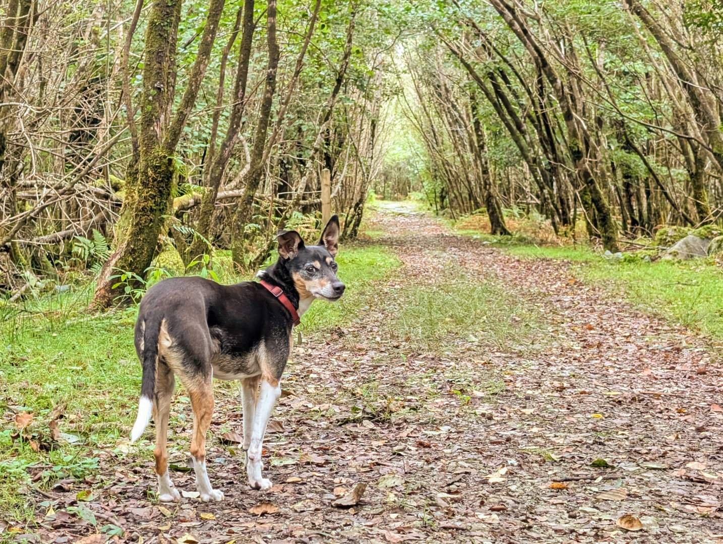 Tras veinte minutos de curvas apareció un puente sobre un río rodeado de bosque. A primera vista parecía un lugar de cuento pero cuando nos metimos dentro el hechizo se rompió. Árboles sosos, silencio raro… hasta yo, que siempre encuentro algo que olfatear, no le vi mucho encanto. Así que seguimos.