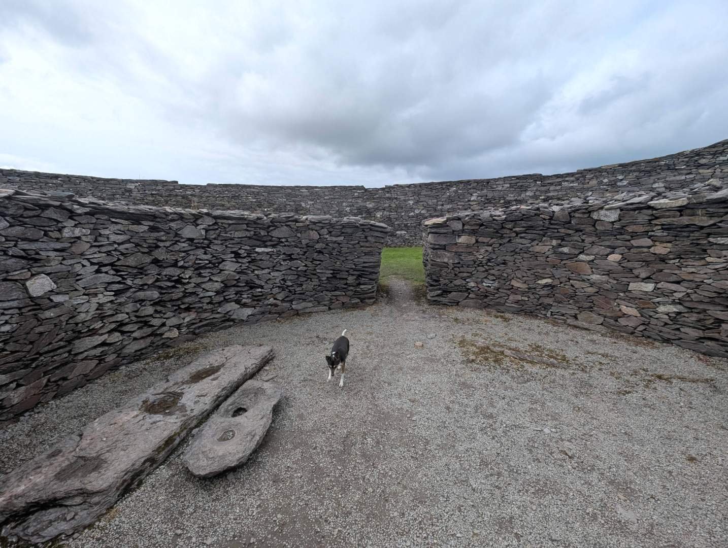 Leacanabuaile ni lo olimos, cerrado al público. Una pena porque yo ya me veía explorando otro laberinto de piedras. Seguimos hasta Ballycarbery Castle. Una ruina envuelta en hiedra, muy bonita para las fotos de postal pero en vivo nos dejó bastante fríos. Yo lo vi y pensé: “Vale, otro castillo roto… ¿dónde está mi premio por buen perro explorador?”.