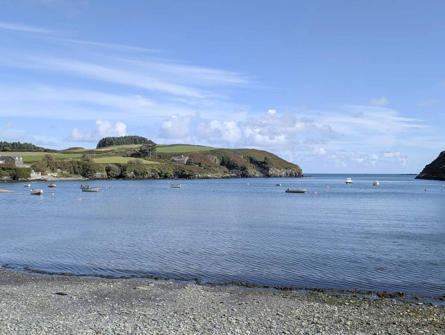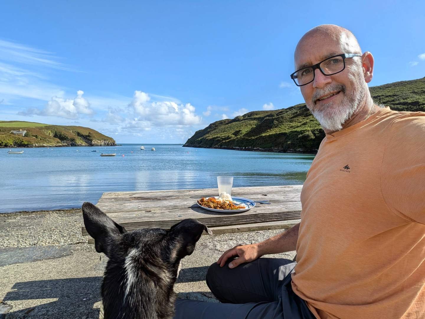 Volvimos al coche y continuamos hasta Carrigillihy Bay Beach. No bajamos a la playa, pero aparcamos con vistas perfectas a la bahía. El aire salado me llenaba la nariz mientras papi Edu cocinaba su comida en la cámper. Después la disfrutó en una mesa de picnic, con el mar de fondo y yo vigilando por si caía algún trocito.