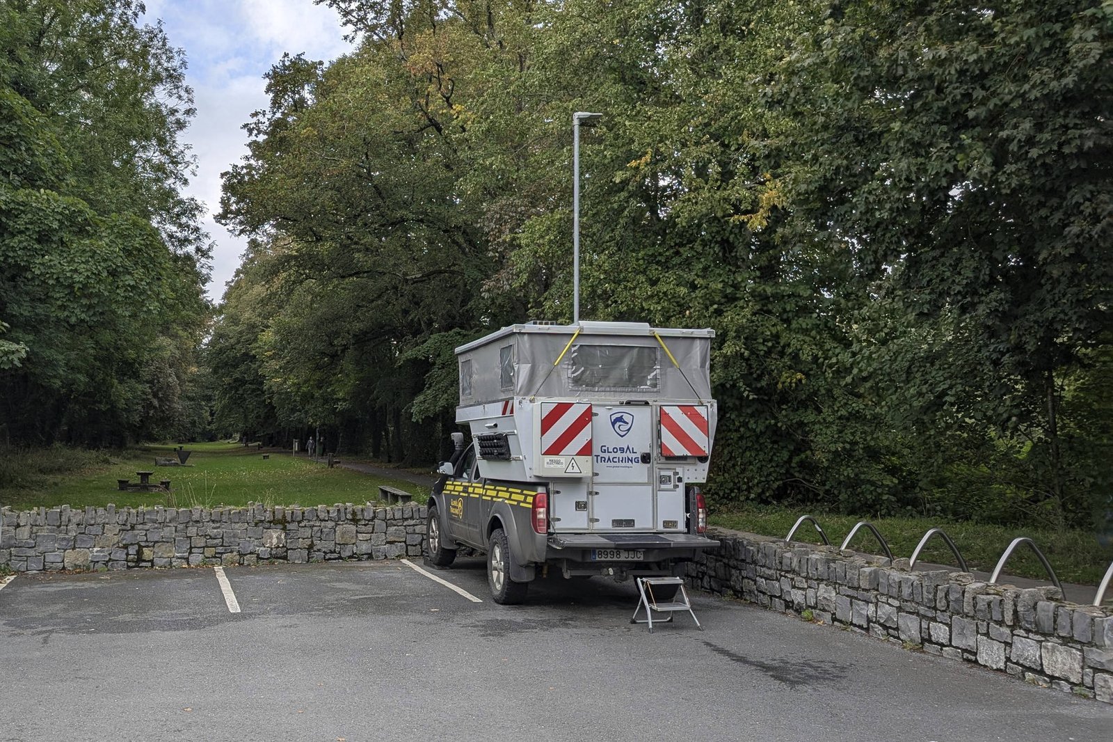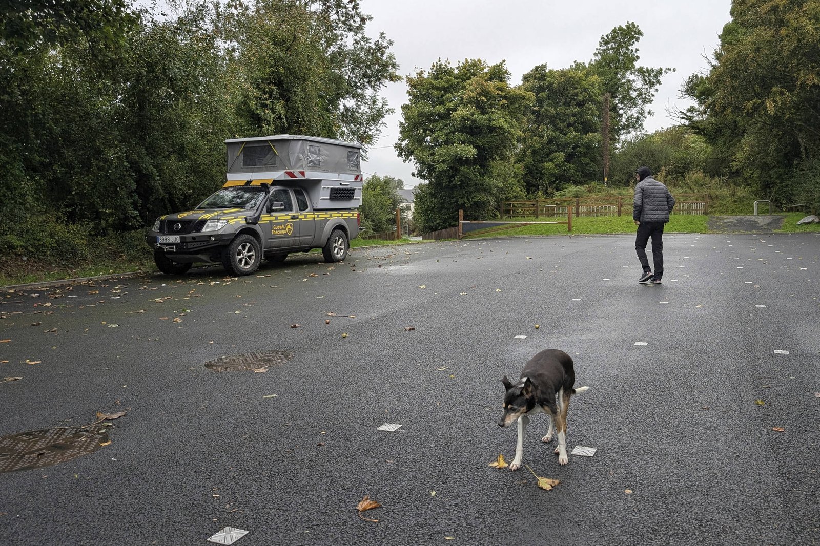 La aventura siguió en una estación de servicio de Applegreen. Y atentos: ¡duchas gratis para humanos! Papi Edu y tito Joan salieron relucientes, mientras yo pensaba “ojalá hubiera también una ducha de salchichas”. Cargamos agua y seguimos buscando un sitio para dormir. Y aquí vino el rally de las barreras: un aparcamiento con barra a dos metros diez, otro a dos metros veinte. Casi pasamos por el segundo, pero las patas de la célula en el techo dijeron que no. Yo ladraba desde atrás: “¡No entramos, no entramos, buscad otro hueso de aparcamiento!”.