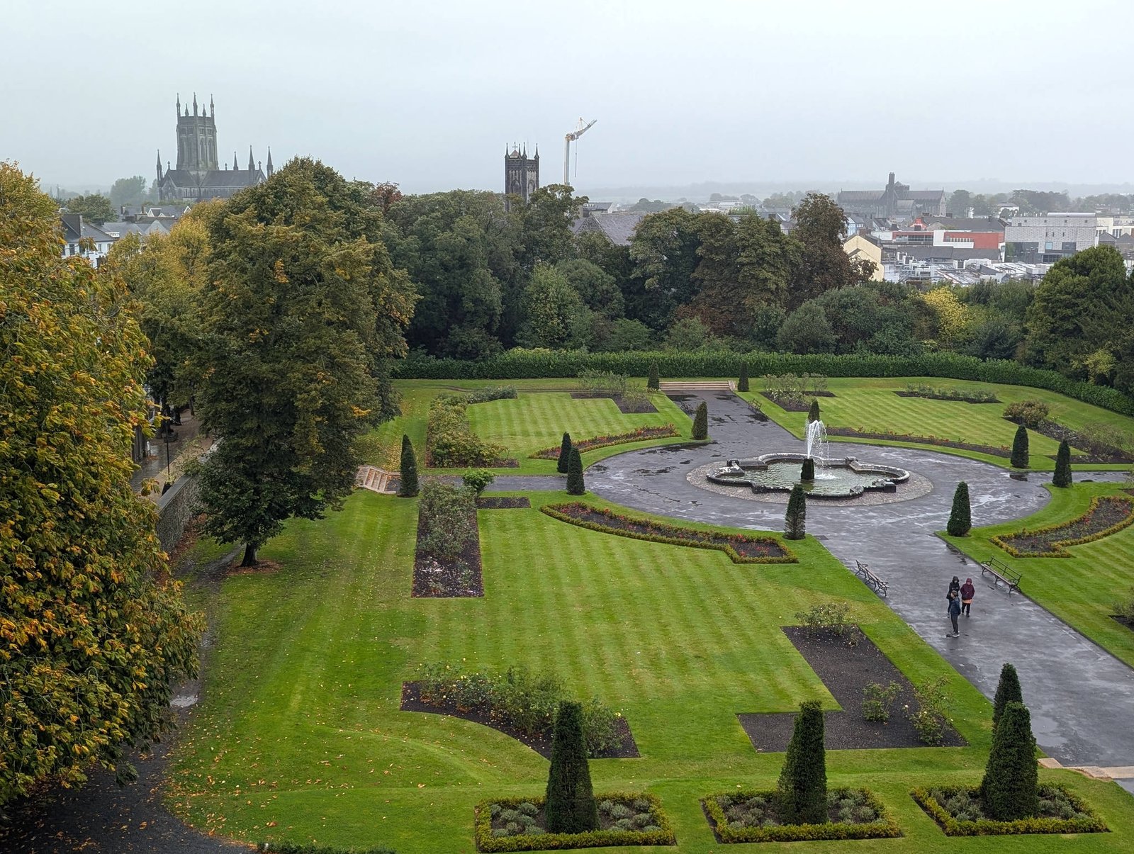 Ellos se pasaron un buen rato allí dentro, maravillándose con los tapices y los muebles. Yo sospecho que olía a siglos de historias, pero no me dejaron comprobarlo con mi hocico. Después cruzaron a lo que llaman Kilkenny Design Centre, justo enfrente. ¡Ja! Más bien era el “Kilkenny Cierra Centre” porque el centro estaba cerrado, salvo las tiendas de regalos. Menos mal, porque así pudieron comprar cosas que yo no puedo morder.