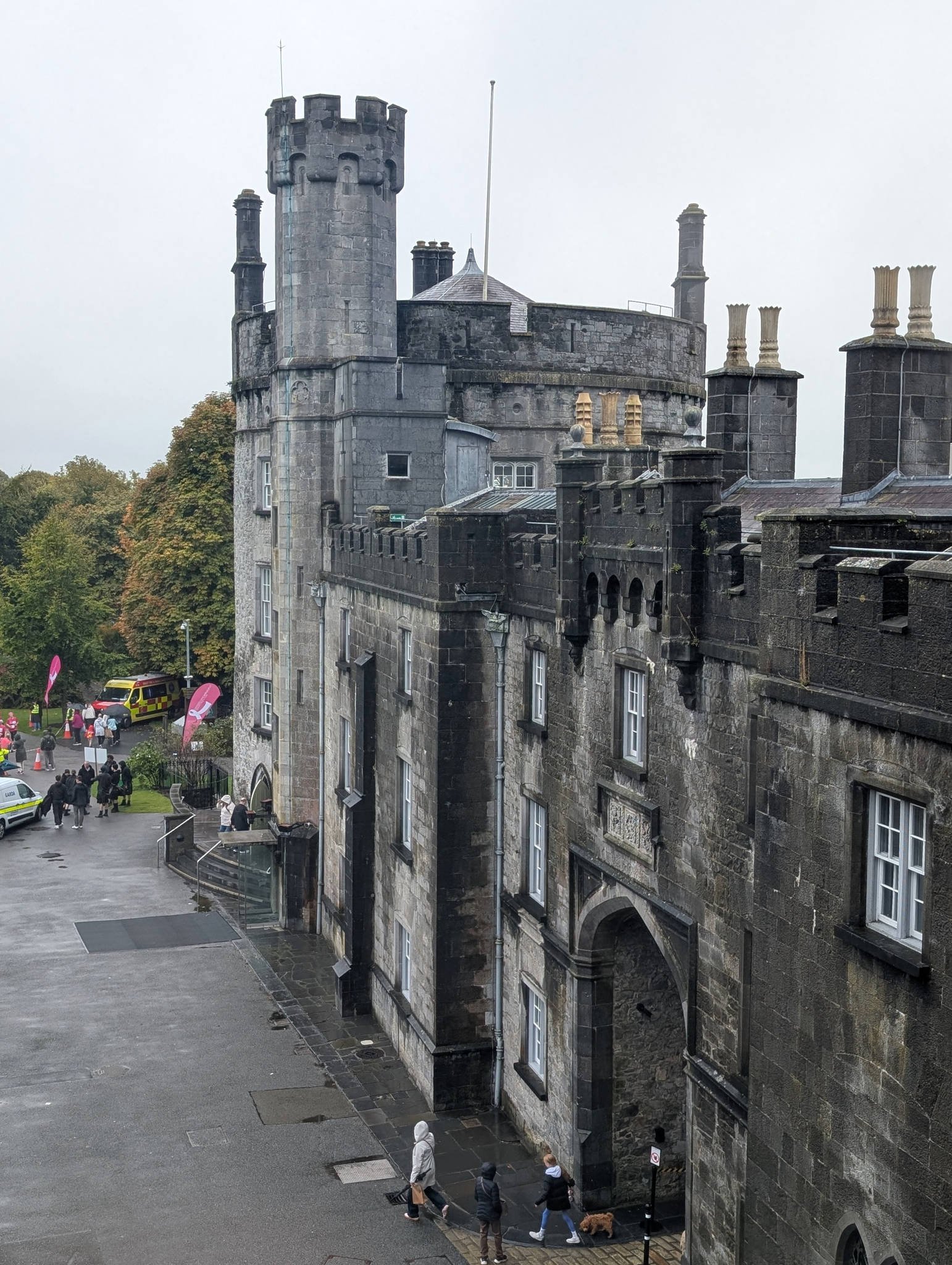La noche fue tan tranquila que ni un murciélago bostezó. Por la mañana chispeó un poco, esas gotitas que parecen que no mojan pero te dejan oliendo a perro recién lavado. Cuando por fin se despejó, arrancamos motores. ¡Kilkenny nos esperaba! Aunque estábamos al lado, tardamos media hora en encontrar aparcamiento porque papi Edu quería dejar la cámper pegadita al castillo. Y claro, había algún evento deportivo y todo el barrio estaba lleno de coches de humanos que huelen a sudor y adrenalina.