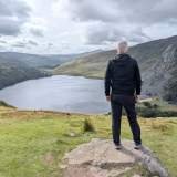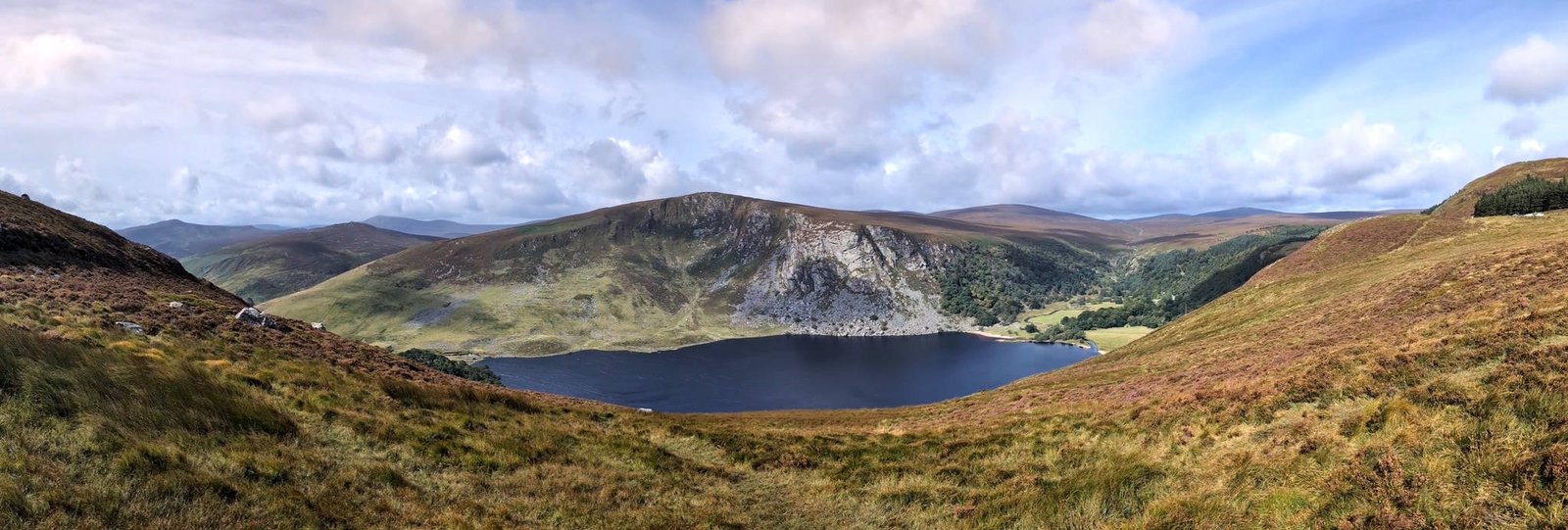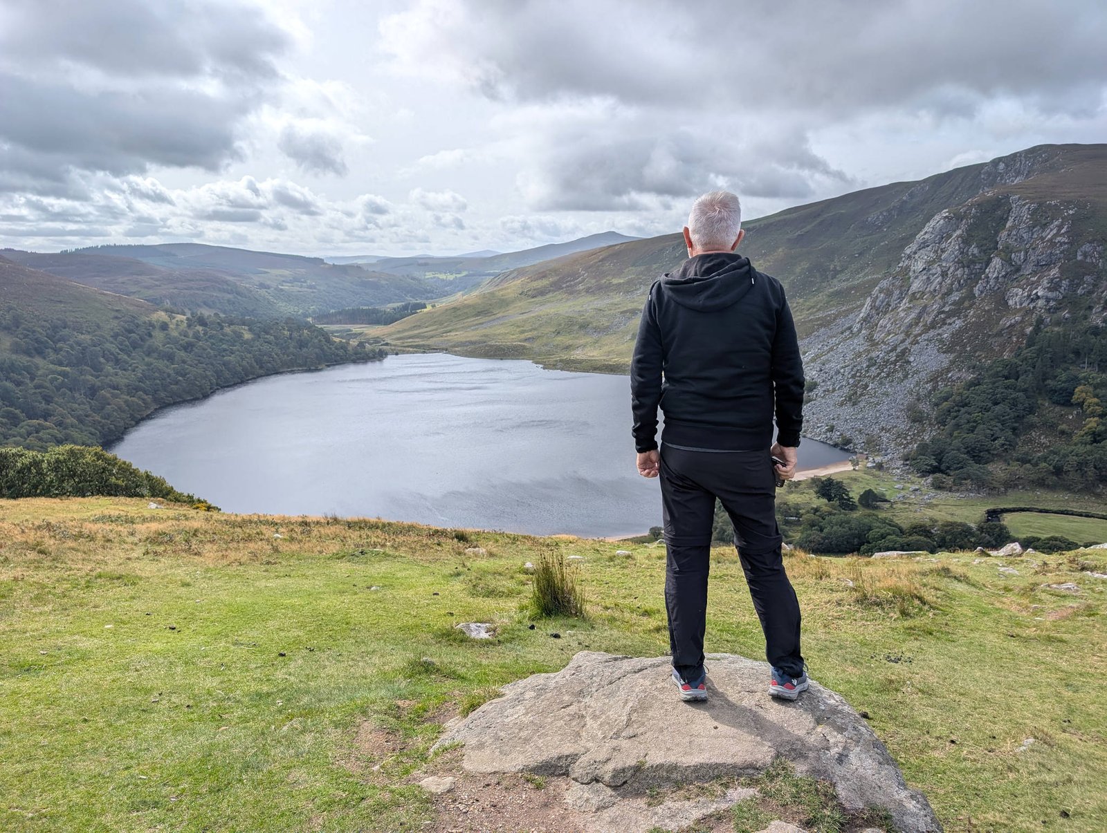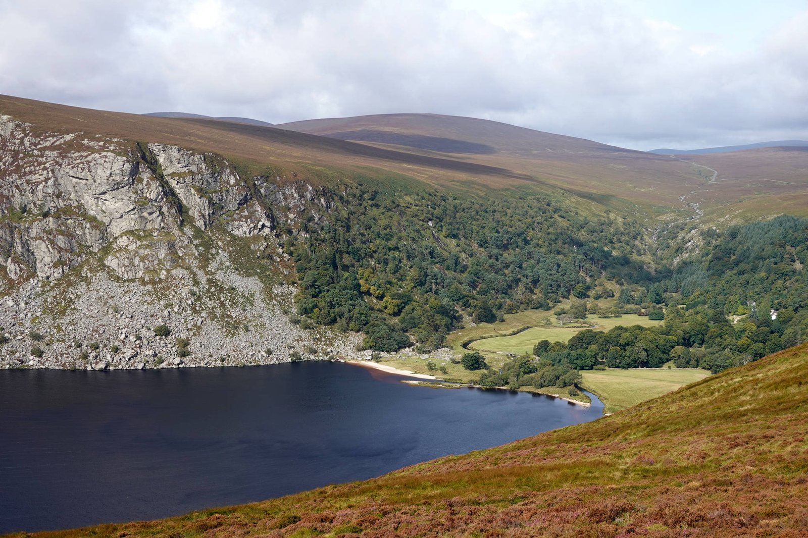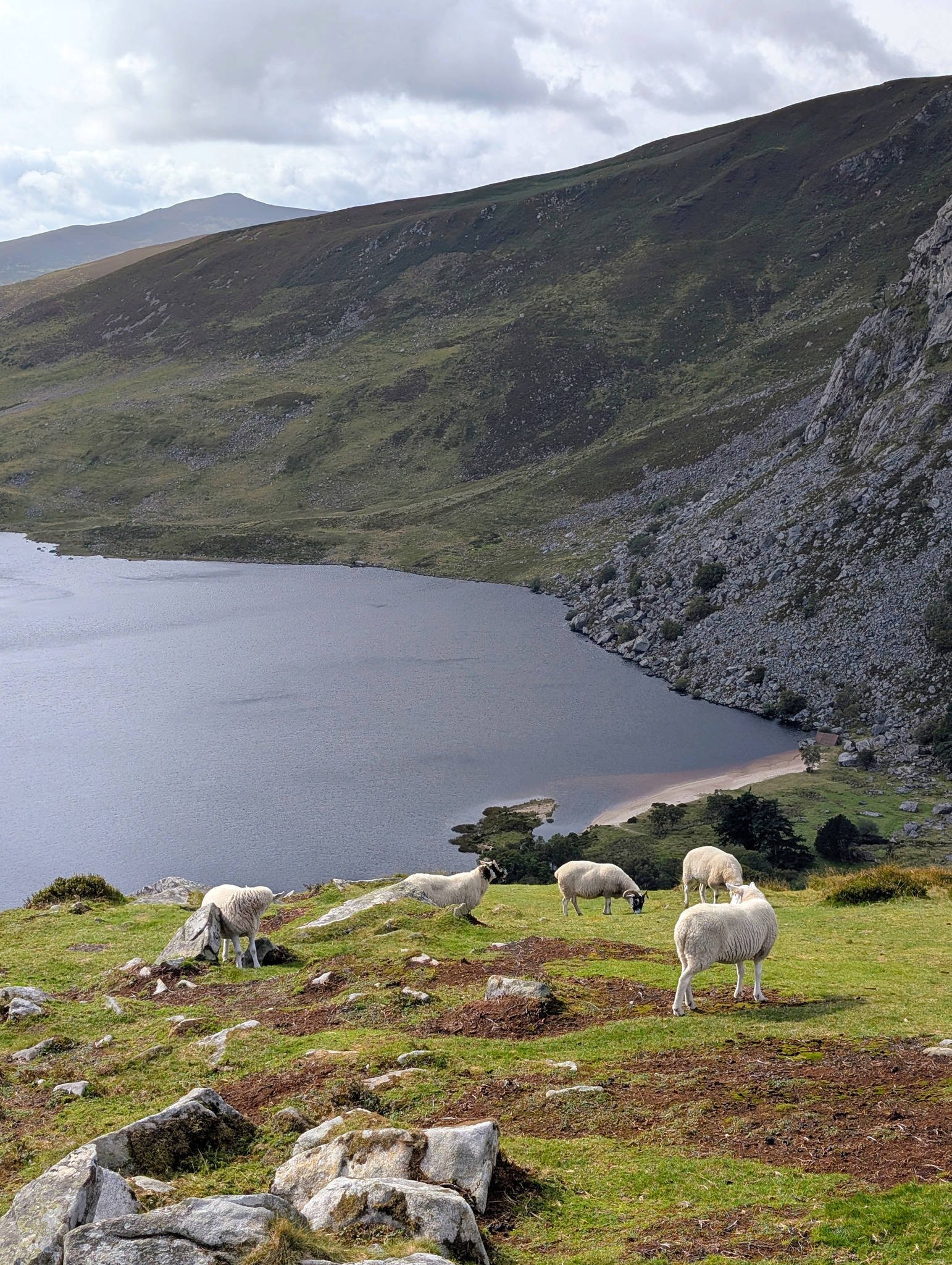 Media hora de coche más tarde nos plantamos en lo alto de un mirador que daba al famoso Lough Tay. Y os prometo que pocas veces he visto algo tan peculiar. Desde allá arriba, el lago parecía una taza de Guinness servida con precisión de camarero experto. El agua, oscura como una pinta recién tirada, y en una de sus orillas una franja clara de arena que hacía de espuma. No es casualidad que lo llamen “Guinness Lake”, ya que durante generaciones perteneció a la familia Guinness, los reyes de la cerveza irlandesa. El único problema era el viento: fuerte, frío, caprichoso, tanto que andar por allí habría sido como jugar a perseguir pelotas en medio de un huracán. Así que nada de paseíto, nos limitamos a contemplar aquel espectáculo natural y volvimos al coche.