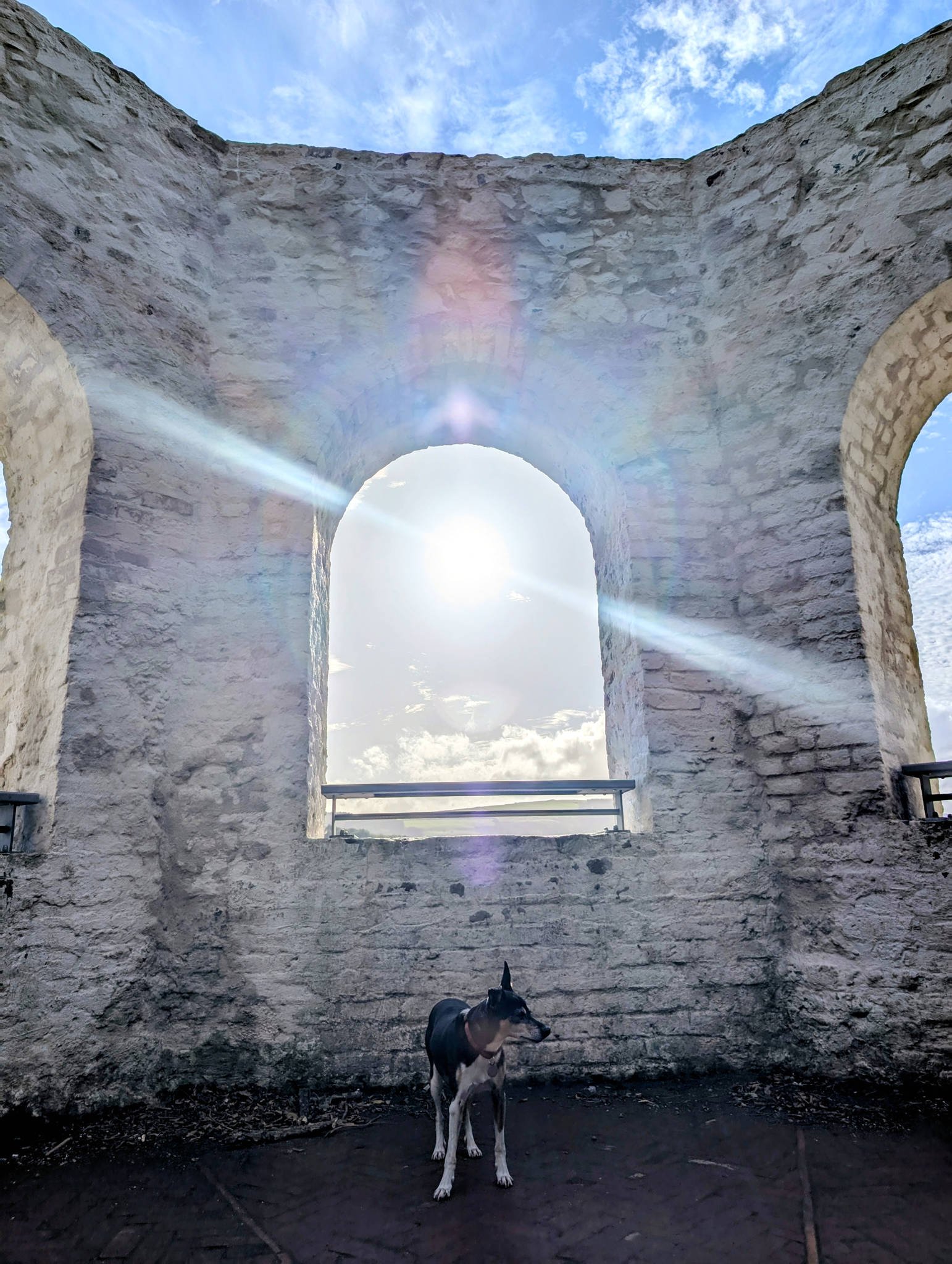 Más tarde paramos en un aparcamiento al lado de la carretera, en Glen of the Downs. Allí se siente el aire fresco de la montaña mezclado con el aroma a hierba y tierra mojada. Comimos en la cámper y luego dimos un paseo por el parque natural Glen of the Downs Nature Trail. No hay mucho que ver, salvo una ruina curiosa llamada The Octagon, un edificio del siglo dieciocho que servía como pabellón de caza y mirador. Hoy parece una cabeza hueca entre los árboles, pero me entretuve olfateando cada rincón y marcando mi propio territorio sobre piedras y raíces.