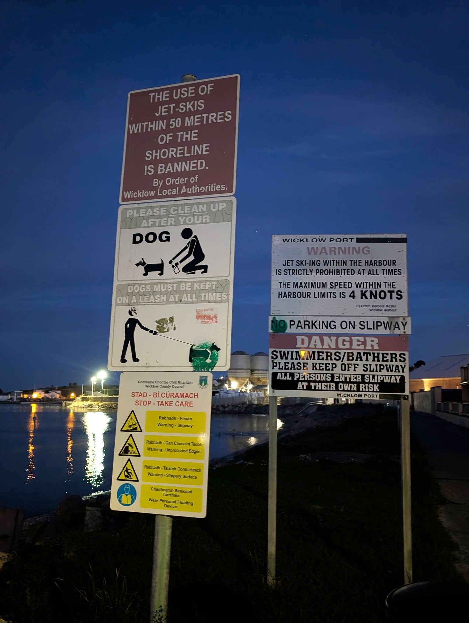 Terminamos la ruta en un aparcamiento al norte de Wicklow, frente a la costa. Aquí nos quedaremos a dormir. Antes de recogernos, dimos un paseo por el paseo marítimo, si es que a eso se le puede llamar paseo: carteles por todos lados diciendo haz esto, no hagas aquello, cuidado con aquello otro… parecía que cada metro tenía su propio reglamento. Yo pensé: “Si sigo todas las normas, no me muevo ni un centímetro”, así que improvisé, corrí un poquito y me sentí el rey del litoral.