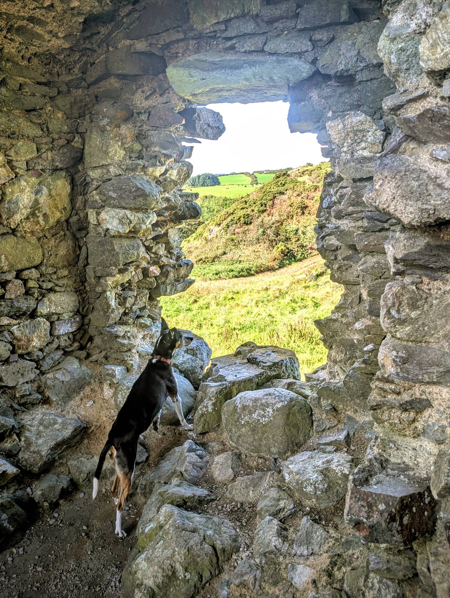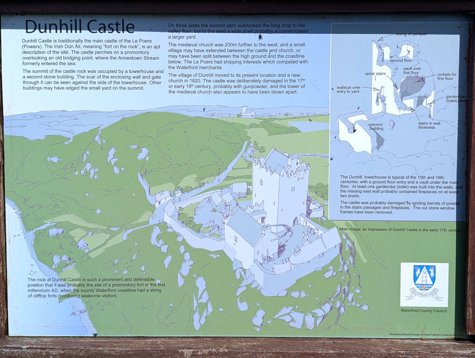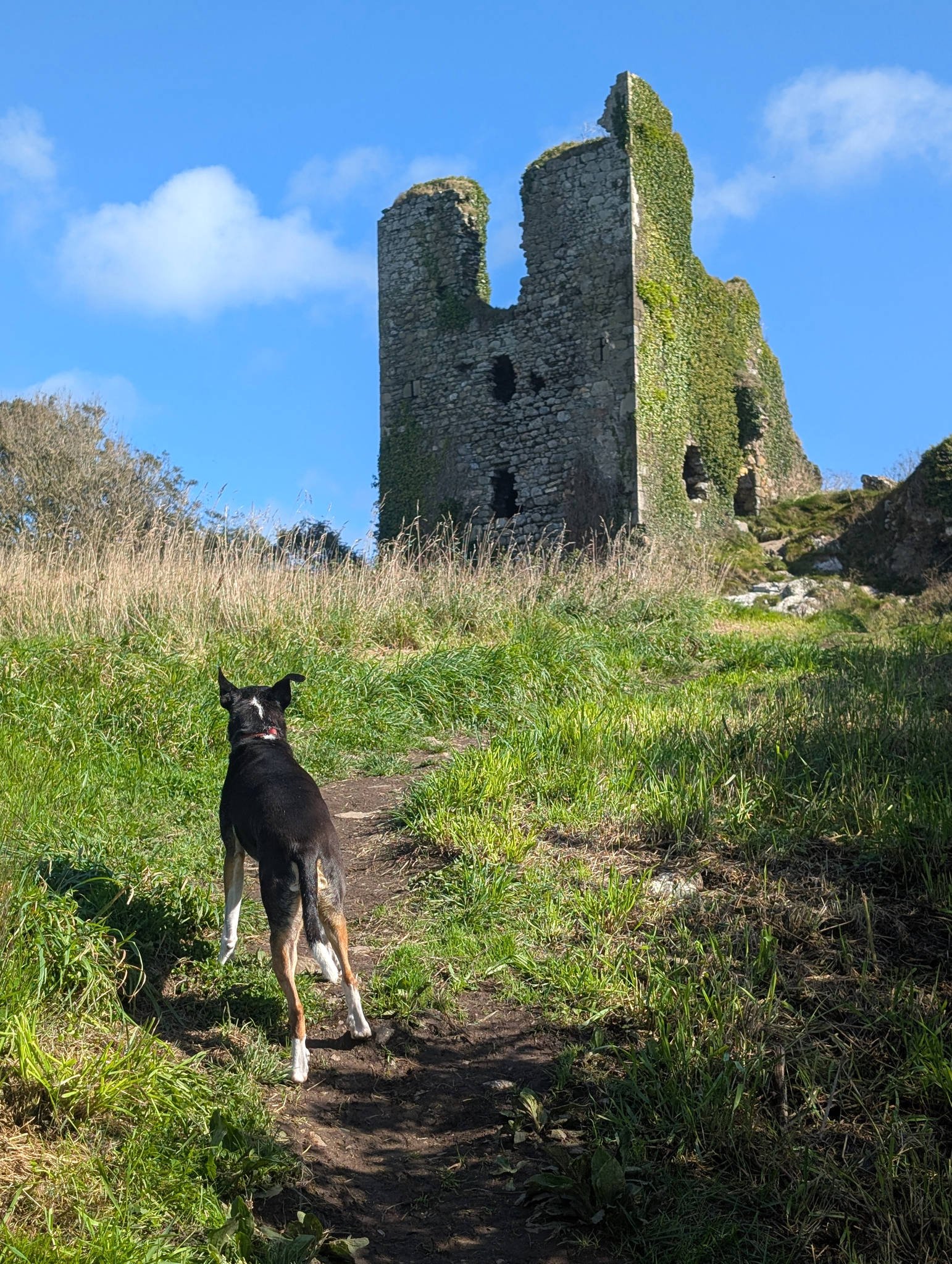 Amanecimos sin prisas, como los perros sabios que saben que el mundo no se va a escapar mientras uno se espatarra un rato más. Después del desayuno perruno y humano, subimos al castillo de Dunhill, que más que castillo parece el esqueleto de uno que se olvidó de ponerse carne. Ruinas abiertas, gratis y sin vallas: lo que viene siendo mi parque de aventuras medieval. Dicen que fue construido hace más de setecientos años por los Fitzgerald, esos nobles que se ve que no conocían los albañiles modernos ni el hormigón. Yo olfateé cada piedra como si estuviera buscando el último hueso templario. Desde arriba se ve todo el valle y yo ladré al viento como si estuviera convocando a mi ejército de ardillas imaginarias.