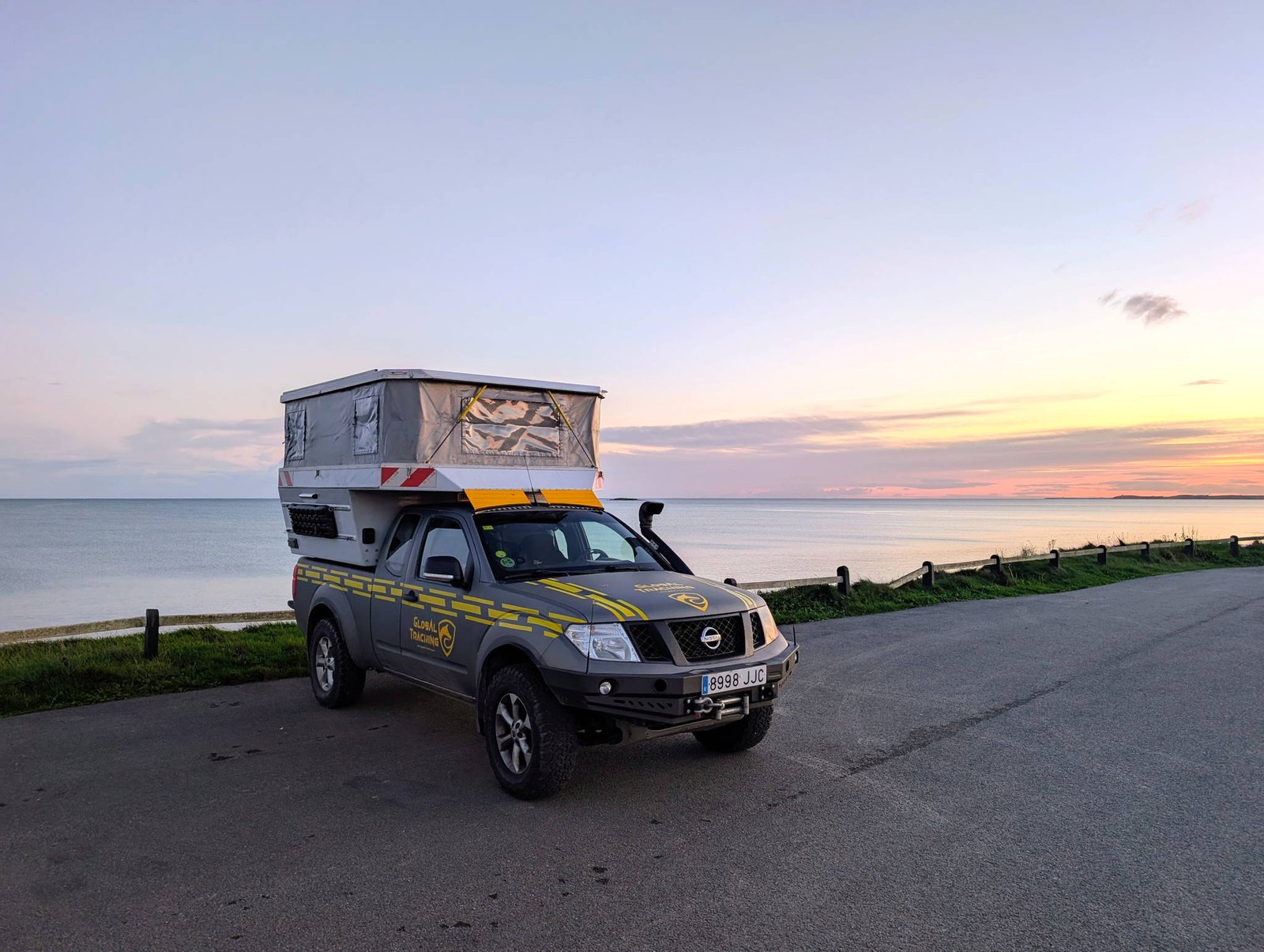 Pasadas las ocho y media llegamos a un aparcamiento chulísimo junto a la costa, con vistas que hasta un gato admiraría en silencio. Al llegar había varios coches y una autocaravana, pero uno a uno se marcharon todos, como si alguien hubiera anunciado ducha obligatoria. Ahora el lugar es nuestro reino nocturno, solo viento suave, rocas, olor a mar y campo de estrellas para tumbarse panza arriba.