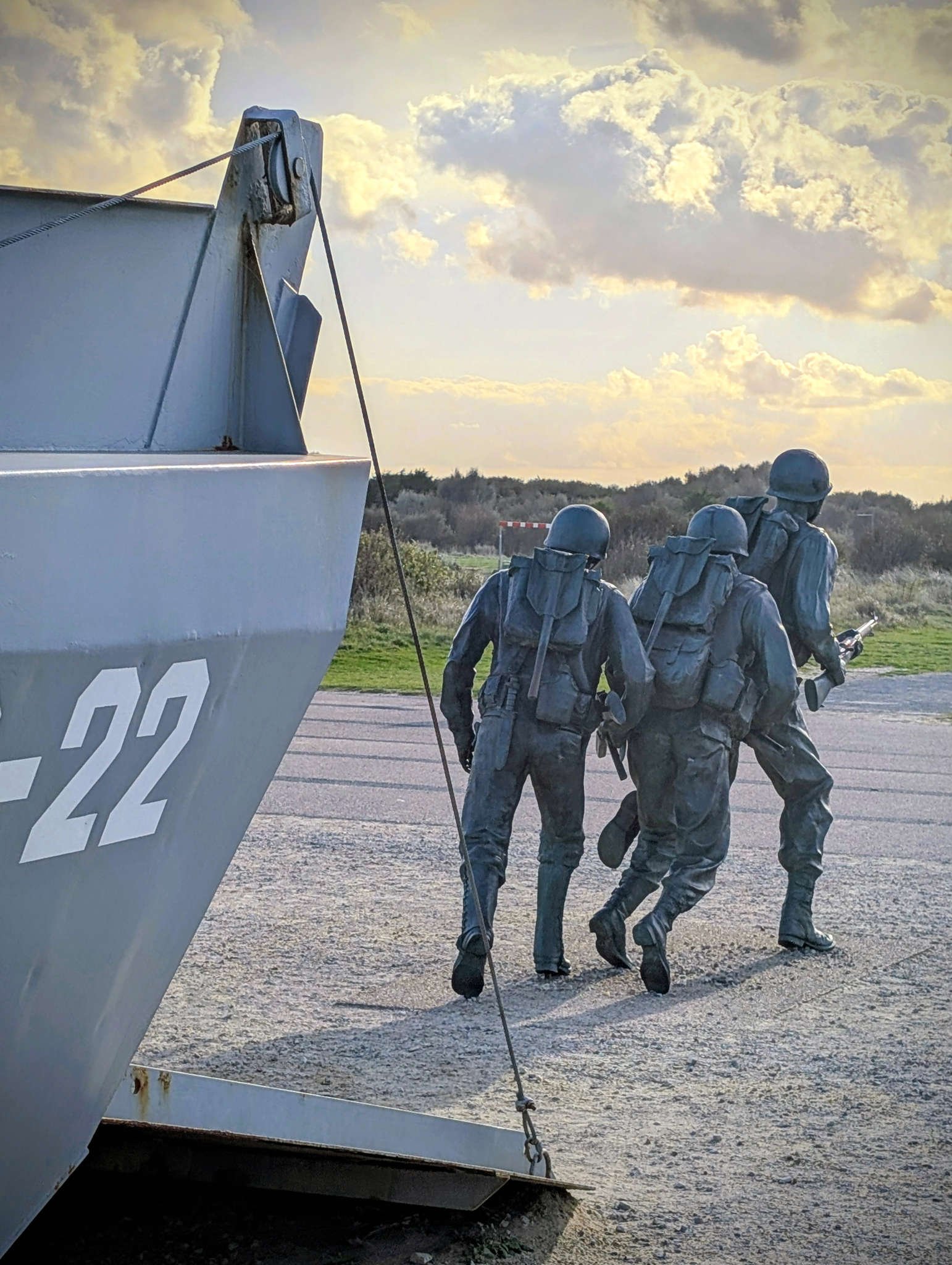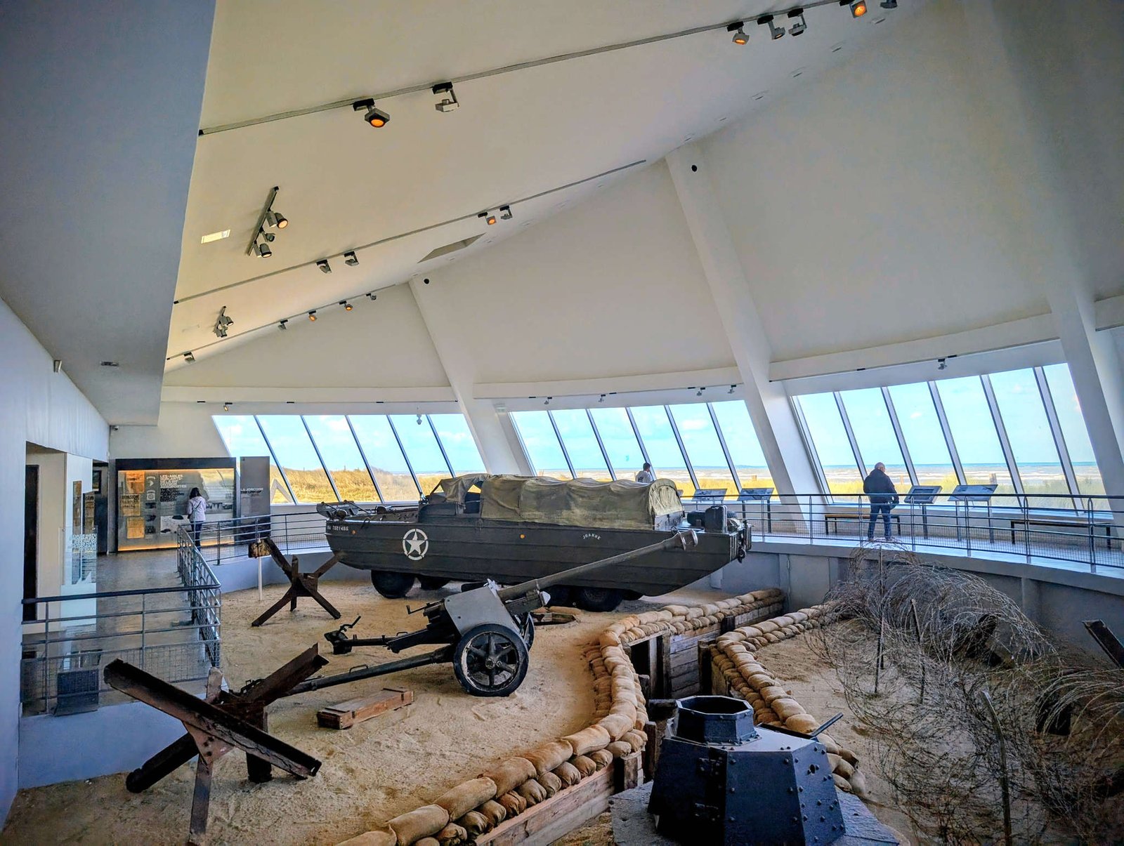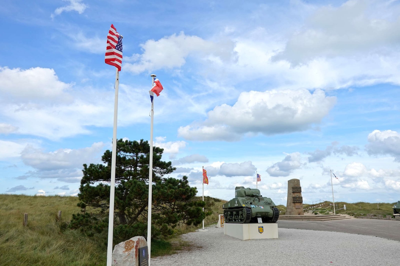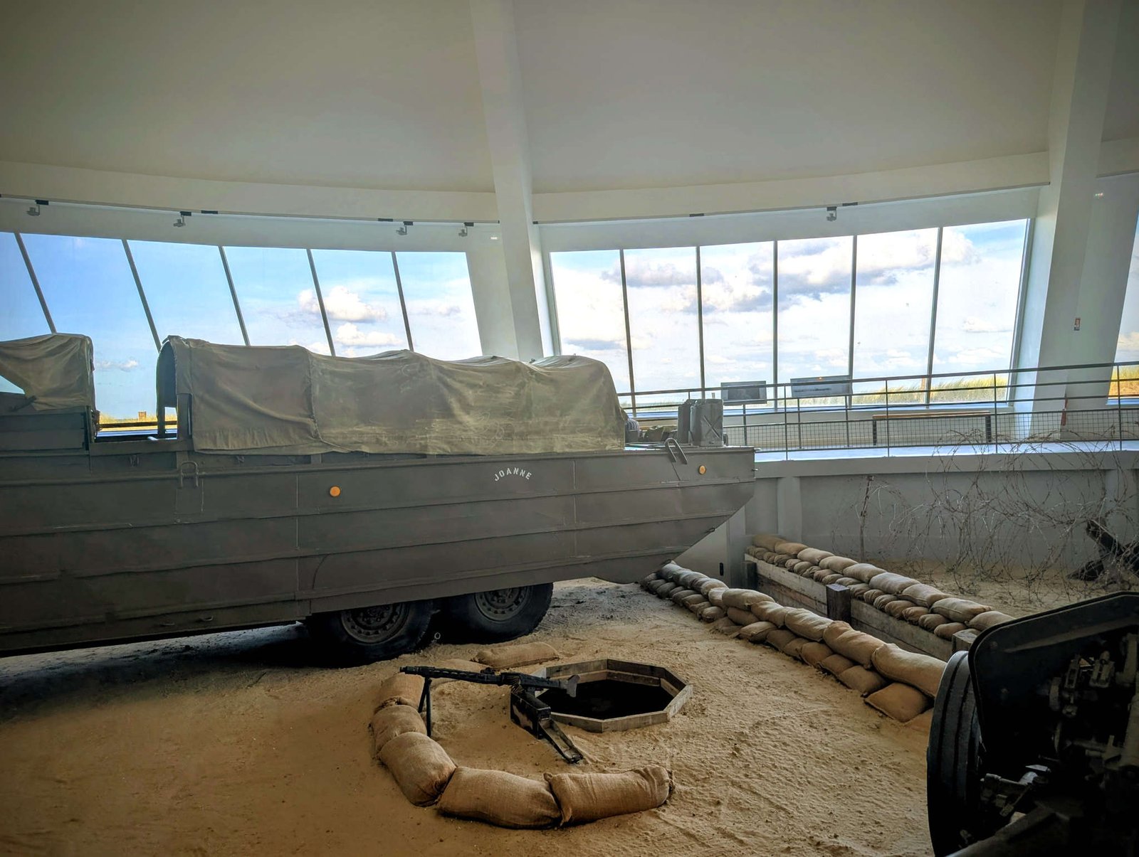 En media hora llegamos a la costa, a un sitio que suena a peli de guerra y galletas: Utah Beach. Una de las cinco playas del desembarco del D-Day en mil novecientos cuarenta y cuatro. Aquí entraron las tropas estadounidenses, y ahora entras tú con tu perro y un tupper de tortilla. Aparcamos en un zona con más memoriales que gaviotas: el Memorial du Débarquement, el Memorial Leclerc y el de la 8th Infantry Division. Cada uno tiene estatuas, placas, banderas y ese aire solemne de “aquí pasó algo enorme y serio”. Entre ellos había vehículos militares originales: jeeps, camiones y bichos con ruedas que todavía huelen a metal histórico.