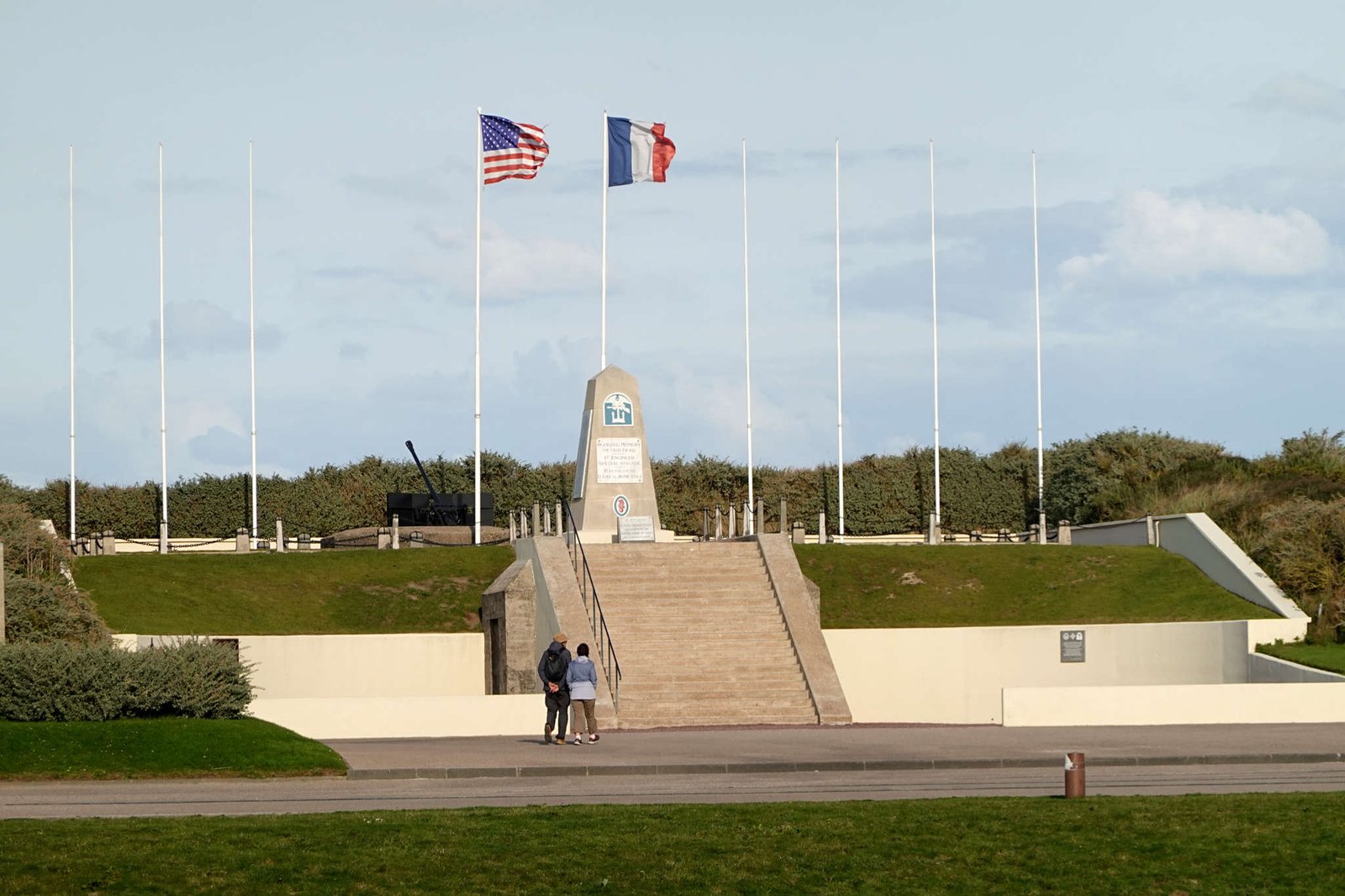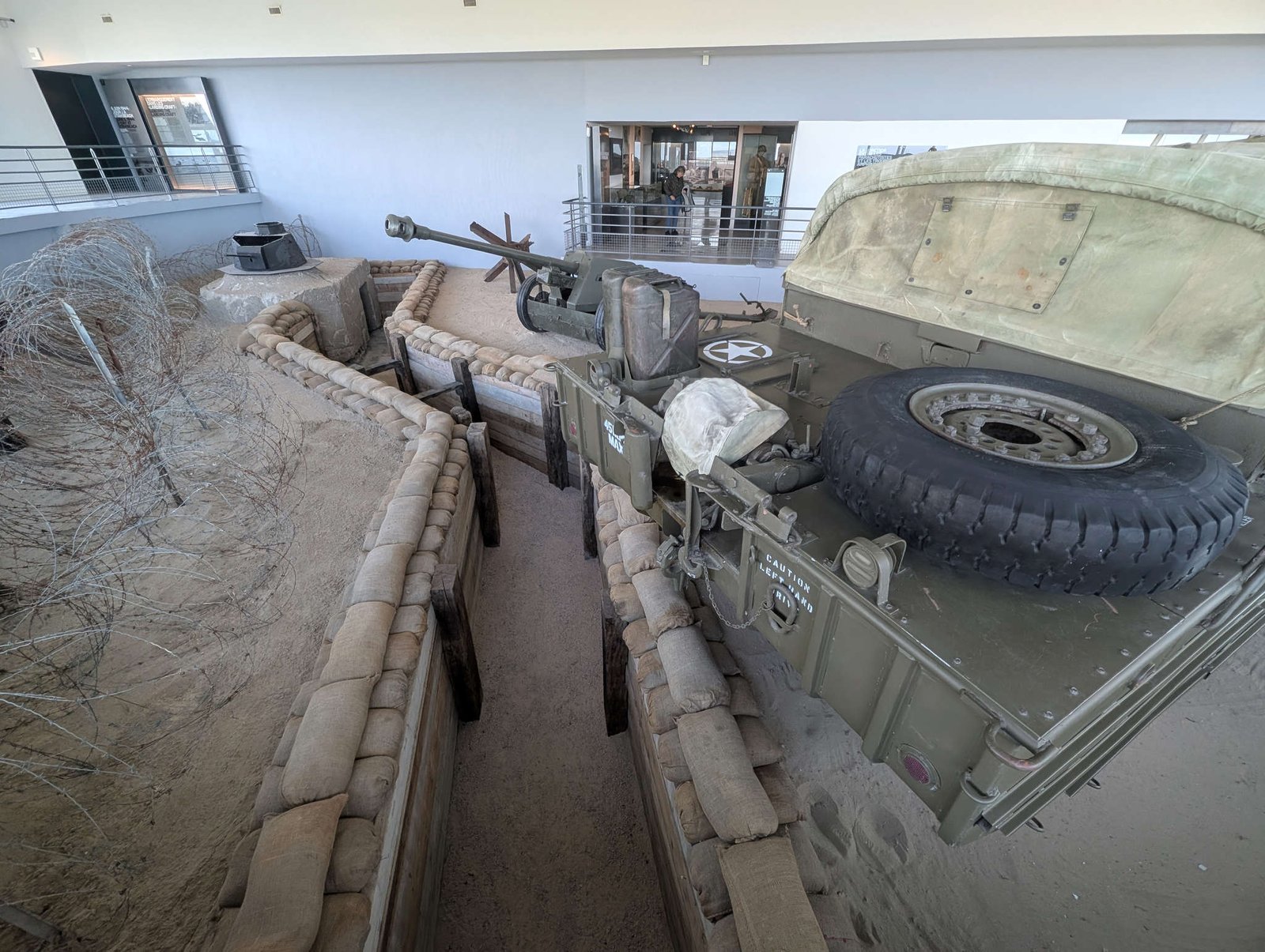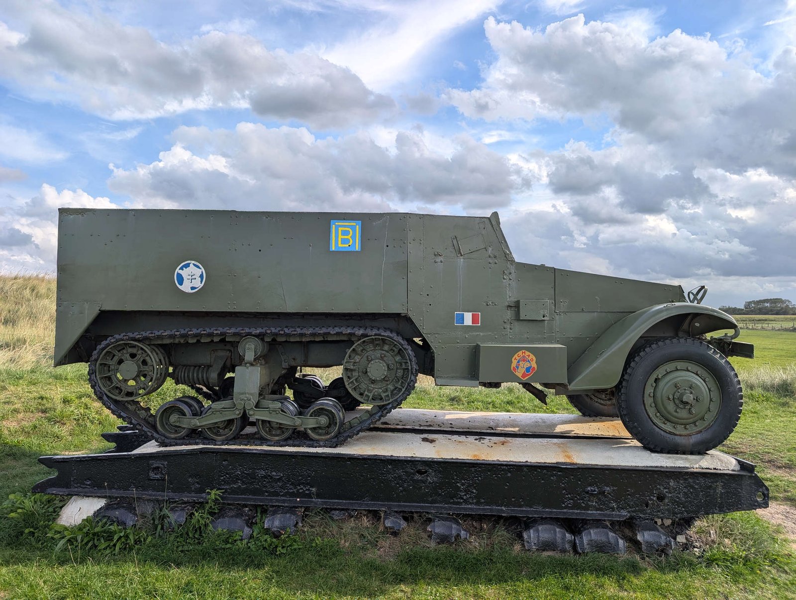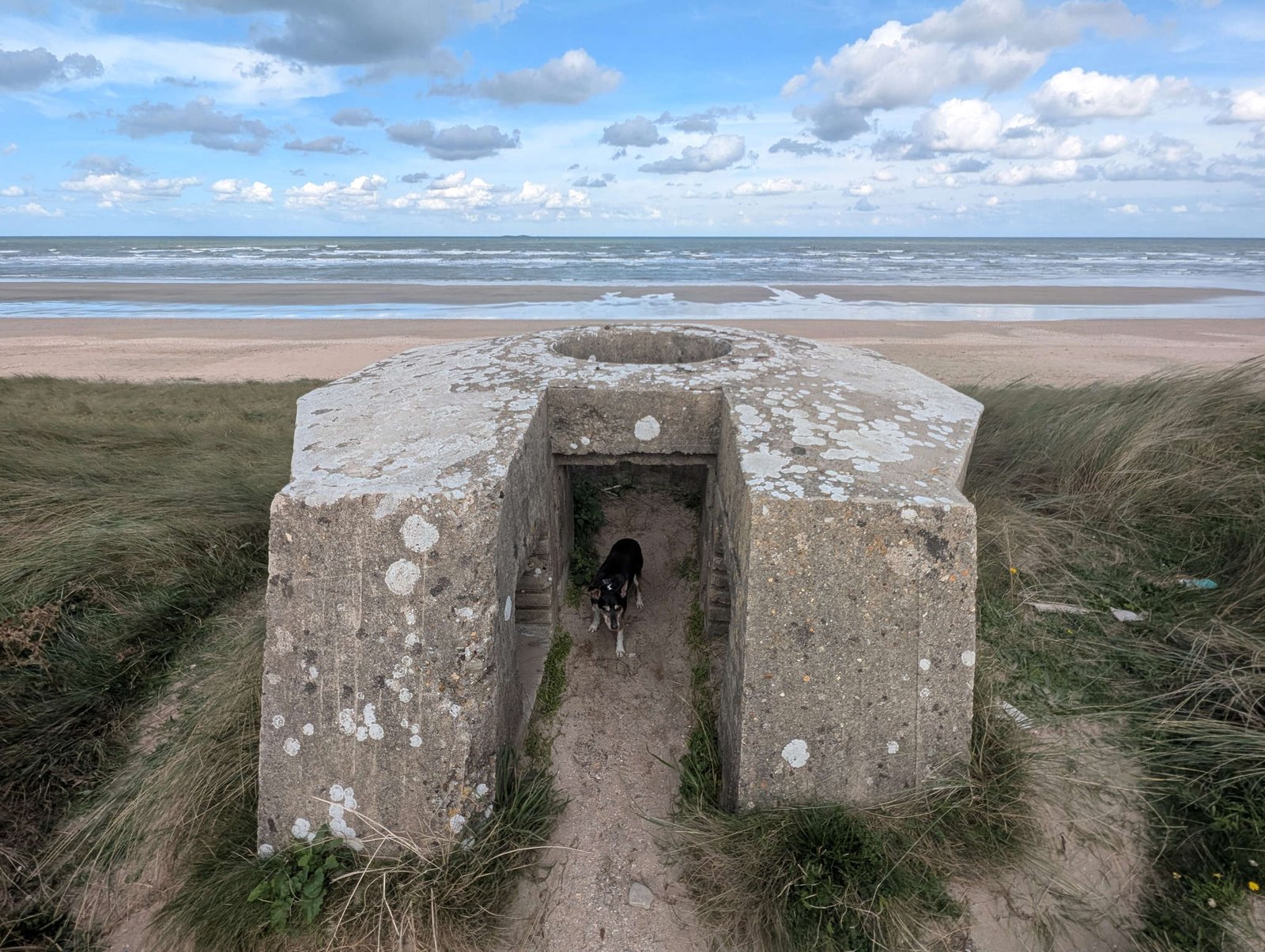 En media hora llegamos a la costa, a un sitio que suena a peli de guerra y galletas: Utah Beach. Una de las cinco playas del desembarco del D-Day en mil novecientos cuarenta y cuatro. Aquí entraron las tropas estadounidenses, y ahora entras tú con tu perro y un tupper de tortilla. Aparcamos en un zona con más memoriales que gaviotas: el Memorial du Débarquement, el Memorial Leclerc y el de la 8th Infantry Division. Cada uno tiene estatuas, placas, banderas y ese aire solemne de “aquí pasó algo enorme y serio”. Entre ellos había vehículos militares originales: jeeps, camiones y bichos con ruedas que todavía huelen a metal histórico.