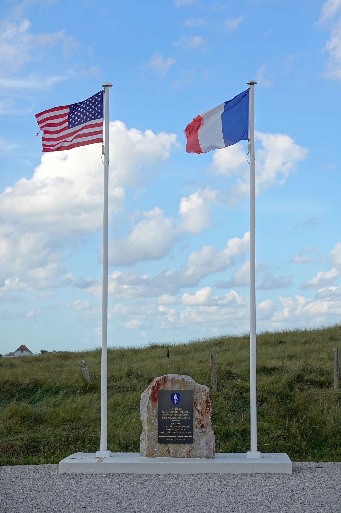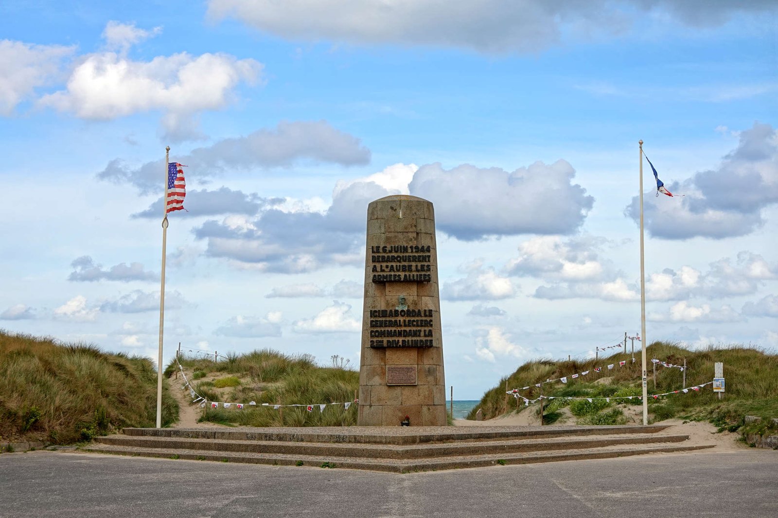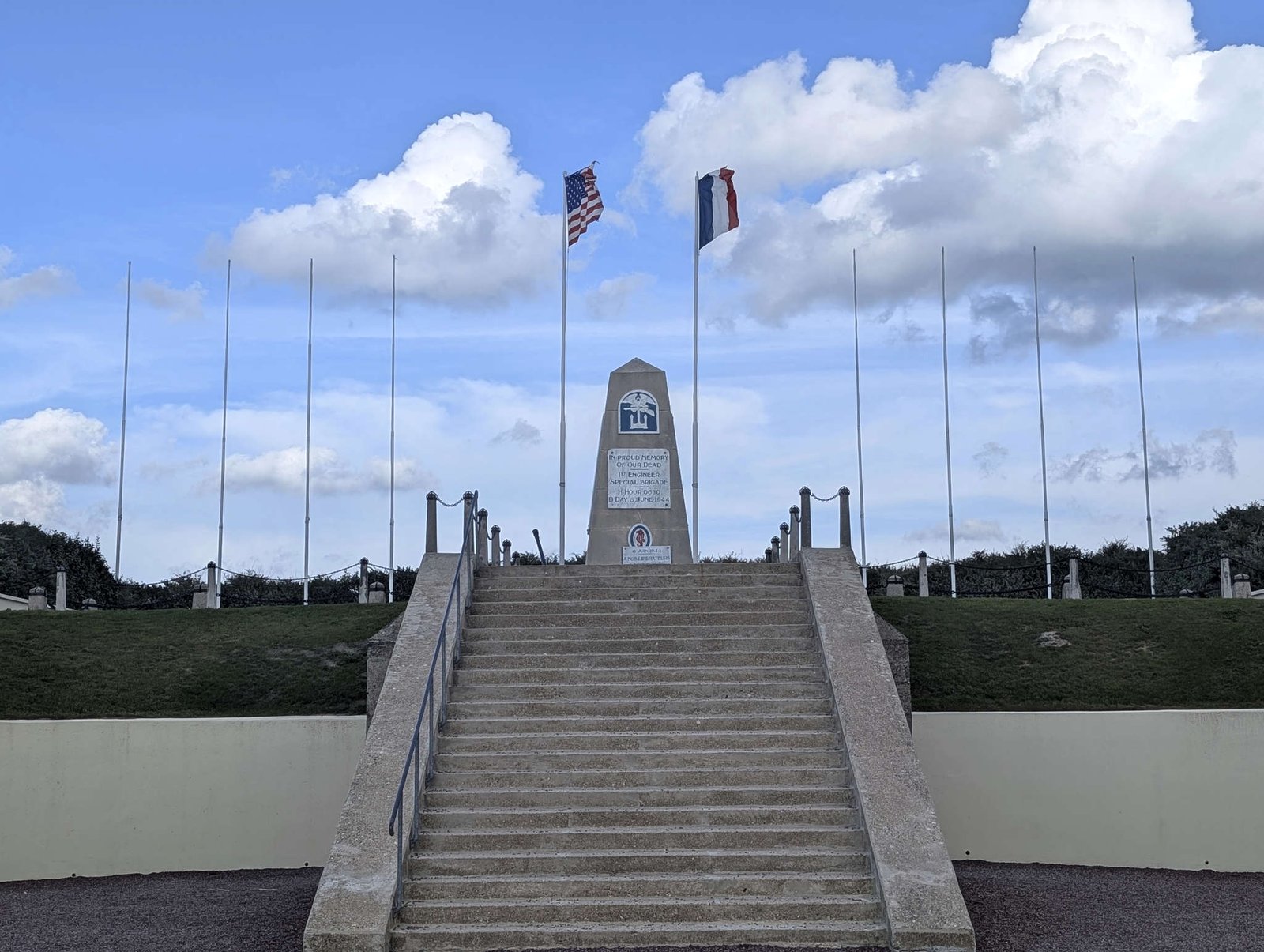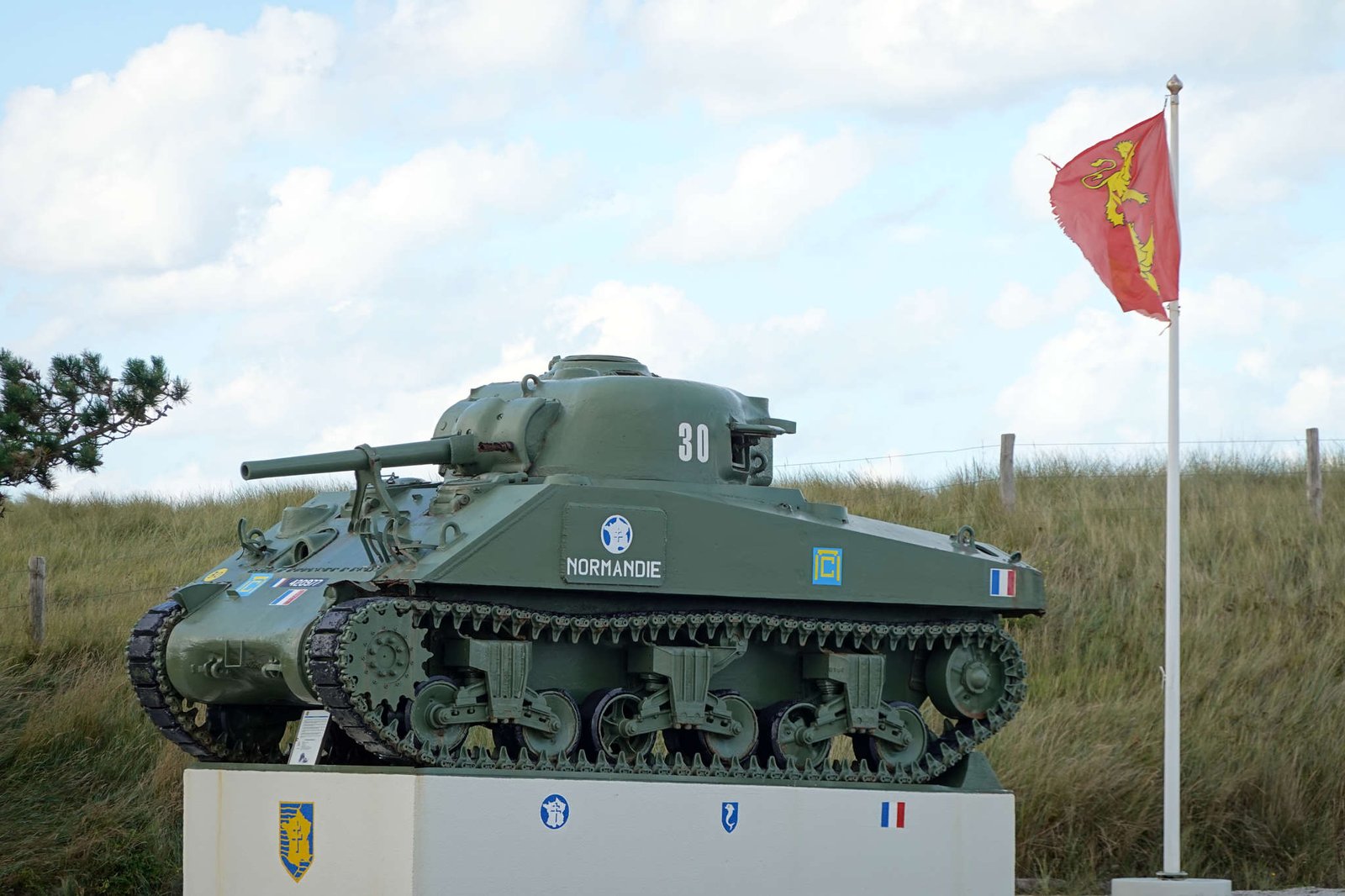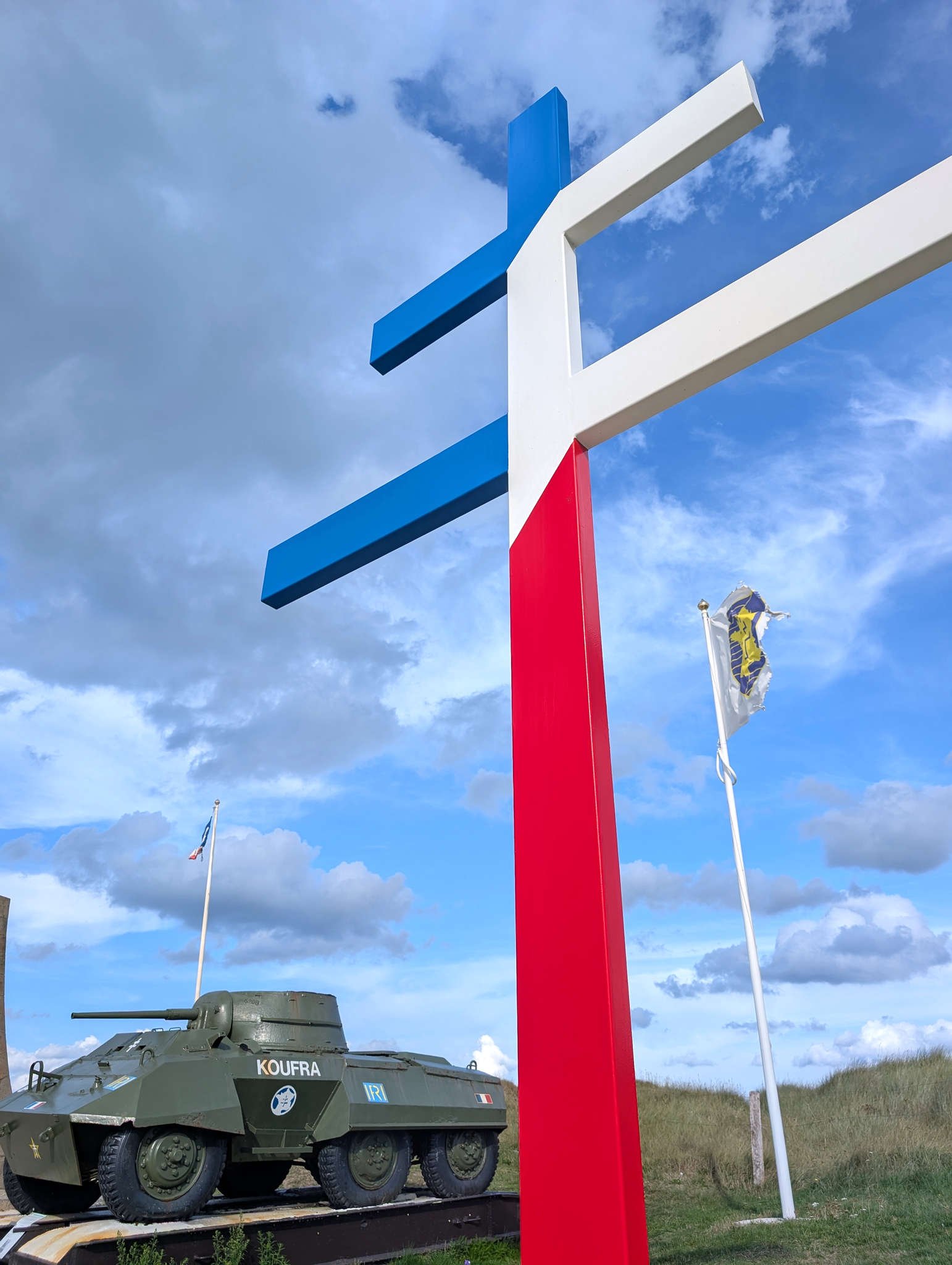 En media hora llegamos a la costa, a un sitio que suena a peli de guerra y galletas: Utah Beach. Una de las cinco playas del desembarco del D-Day en mil novecientos cuarenta y cuatro. Aquí entraron las tropas estadounidenses, y ahora entras tú con tu perro y un tupper de tortilla. Aparcamos en un zona con más memoriales que gaviotas: el Memorial du Débarquement, el Memorial Leclerc y el de la 8th Infantry Division. Cada uno tiene estatuas, placas, banderas y ese aire solemne de “aquí pasó algo enorme y serio”. Entre ellos había vehículos militares originales: jeeps, camiones y bichos con ruedas que todavía huelen a metal histórico.