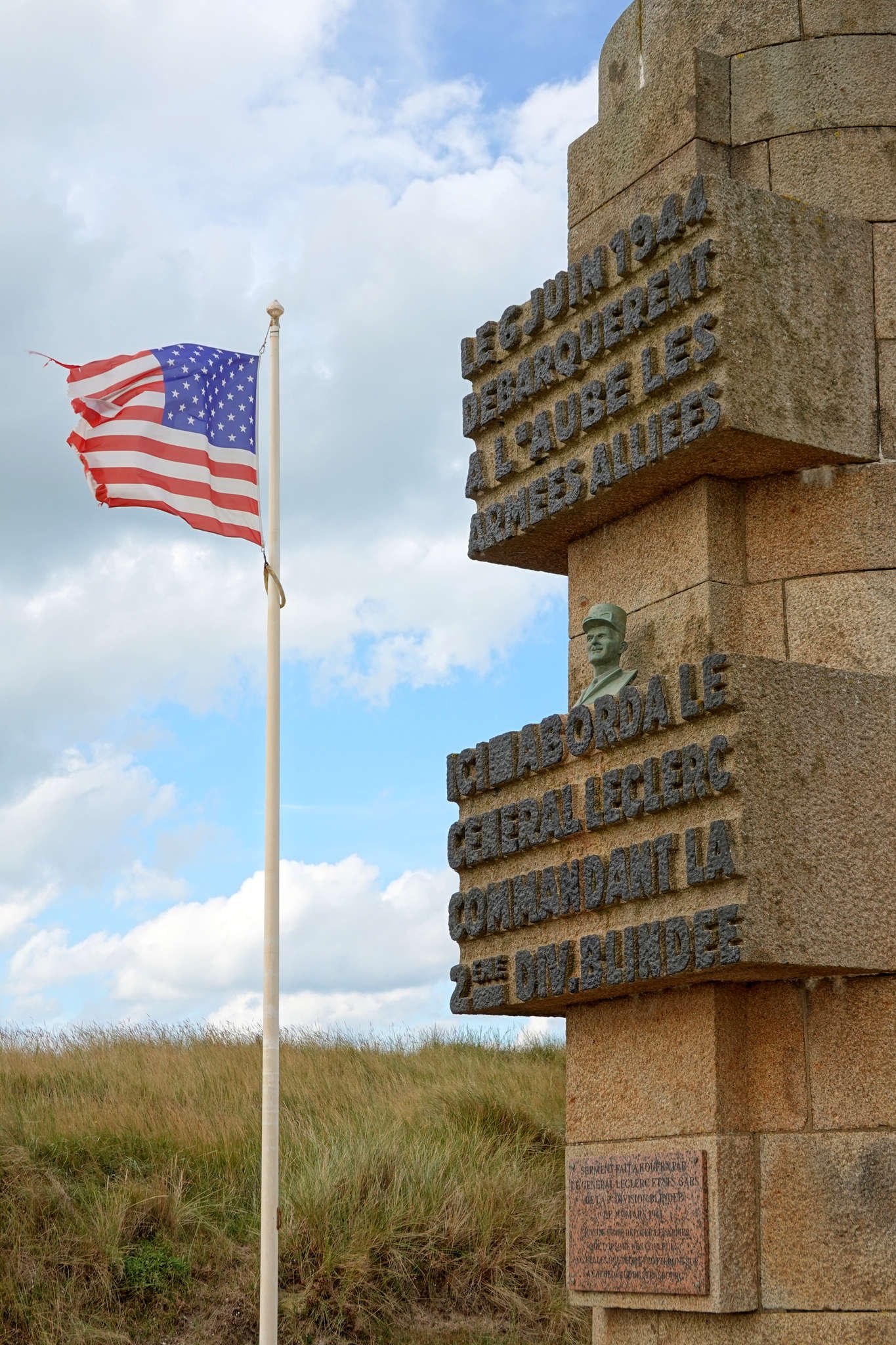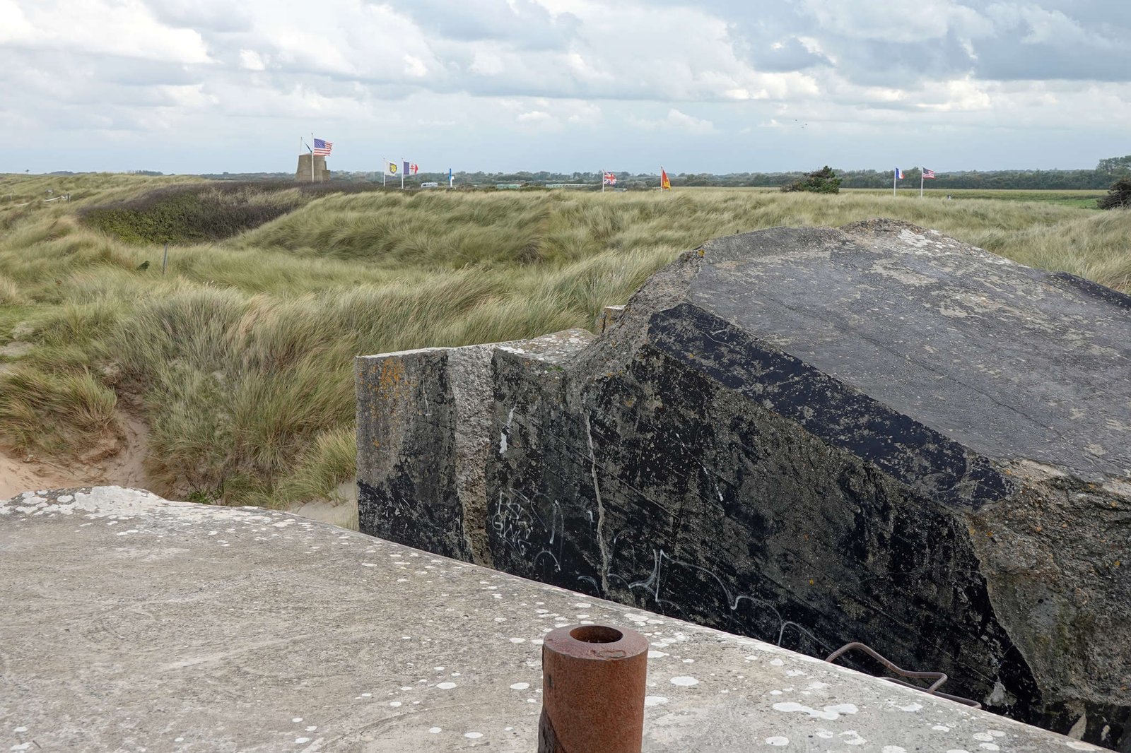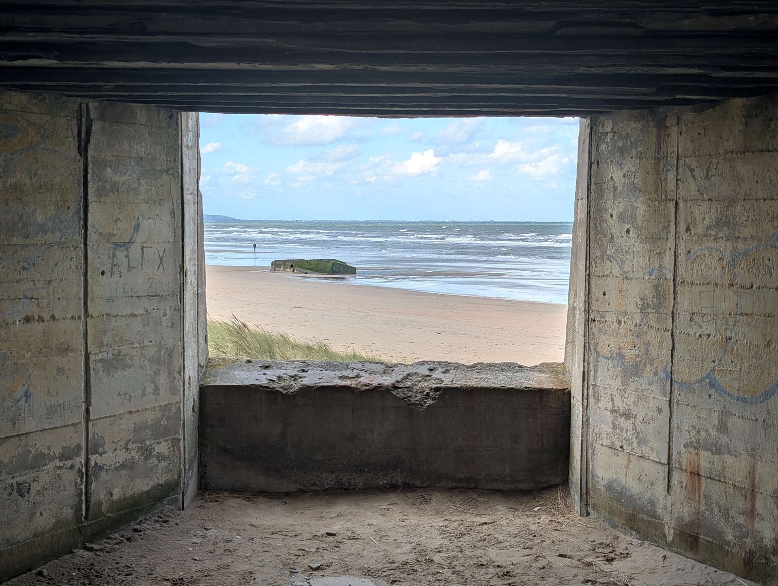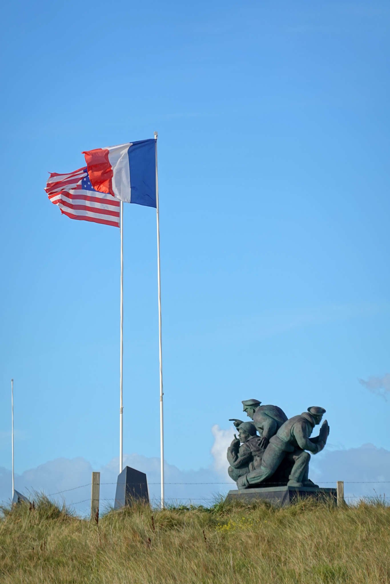 En media hora llegamos a la costa, a un sitio que suena a peli de guerra y galletas: Utah Beach. Una de las cinco playas del desembarco del D-Day en mil novecientos cuarenta y cuatro. Aquí entraron las tropas estadounidenses, y ahora entras tú con tu perro y un tupper de tortilla. Aparcamos en un zona con más memoriales que gaviotas: el Memorial du Débarquement, el Memorial Leclerc y el de la 8th Infantry Division. Cada uno tiene estatuas, placas, banderas y ese aire solemne de “aquí pasó algo enorme y serio”. Entre ellos había vehículos militares originales: jeeps, camiones y bichos con ruedas que todavía huelen a metal histórico.