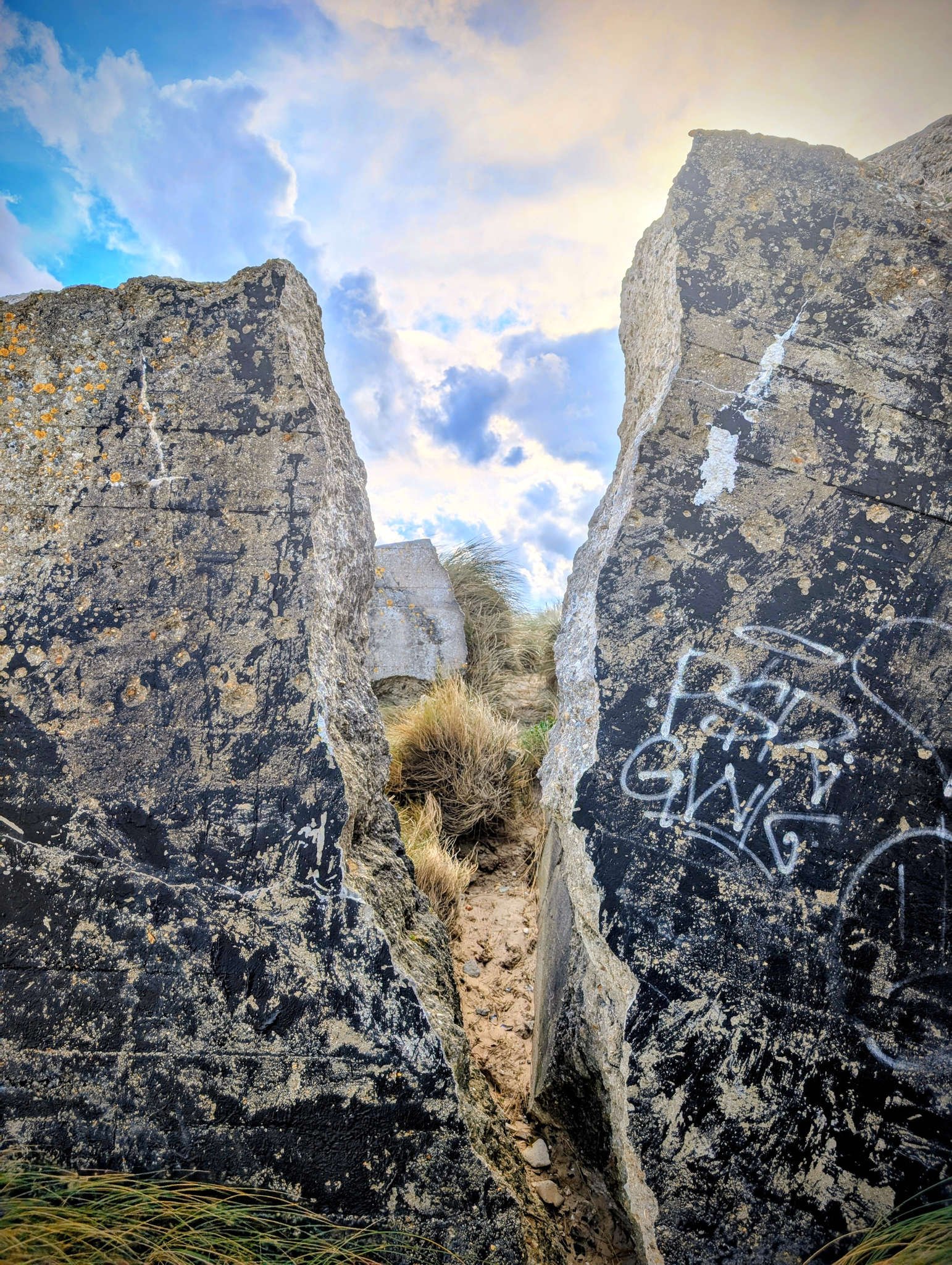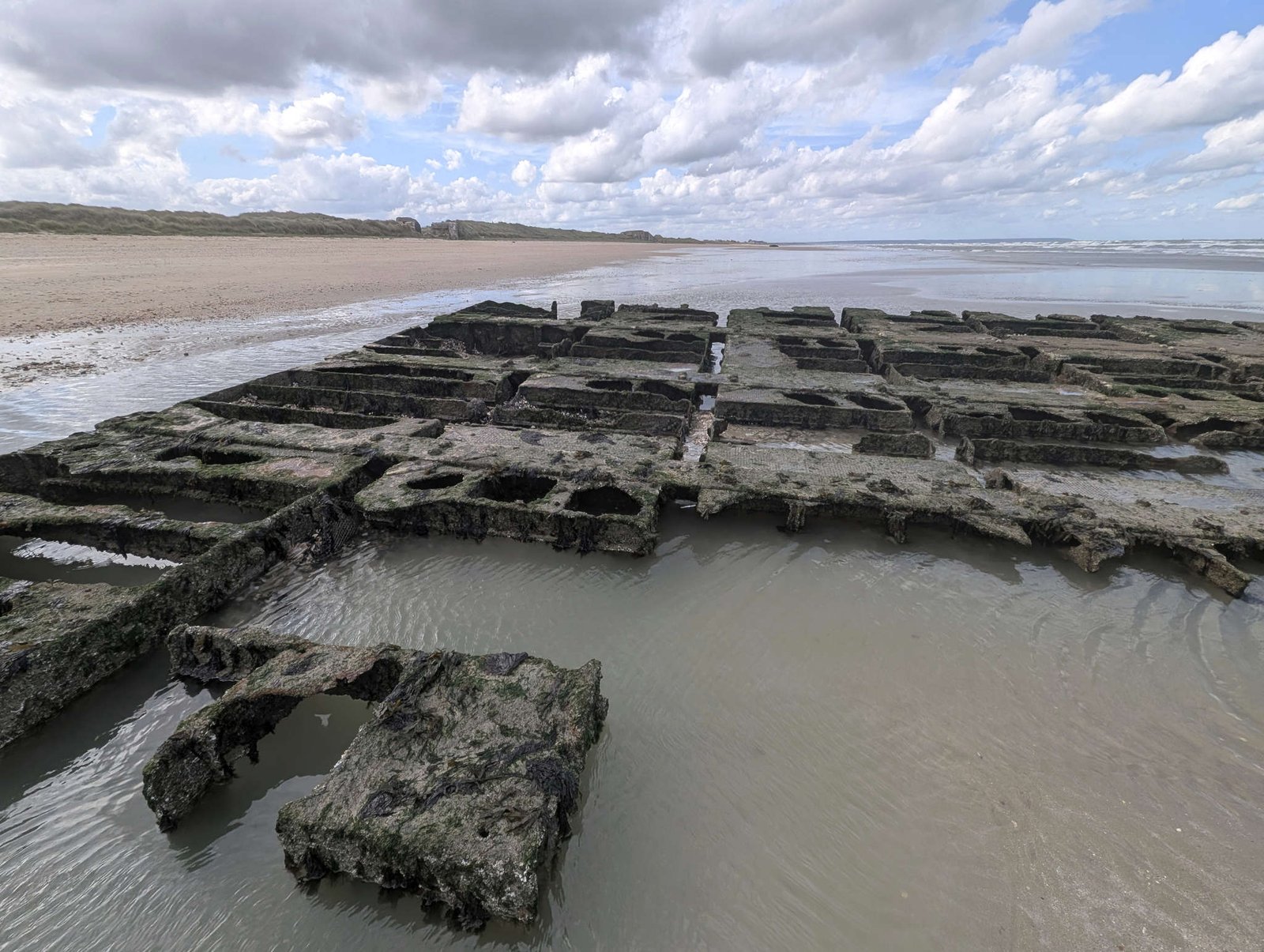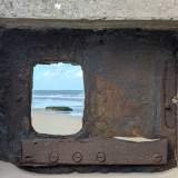 Bajamos a la playa y… ¡arenaaaaaa! Patas libres, orejas al viento y yo corriendo como si me persiguiera un bulldog con impuestos. La playa es larga, plana y con ese viento que te despeina las ideas. Hay búnkeres medio reventados, bloques de hormigón enormes donde antes se escondían humanos asustados, y los restos oxidados de una embarcación que sigue allí más de ochenta años después, como diciendo: “no pienso moverme ni con marea alta”.