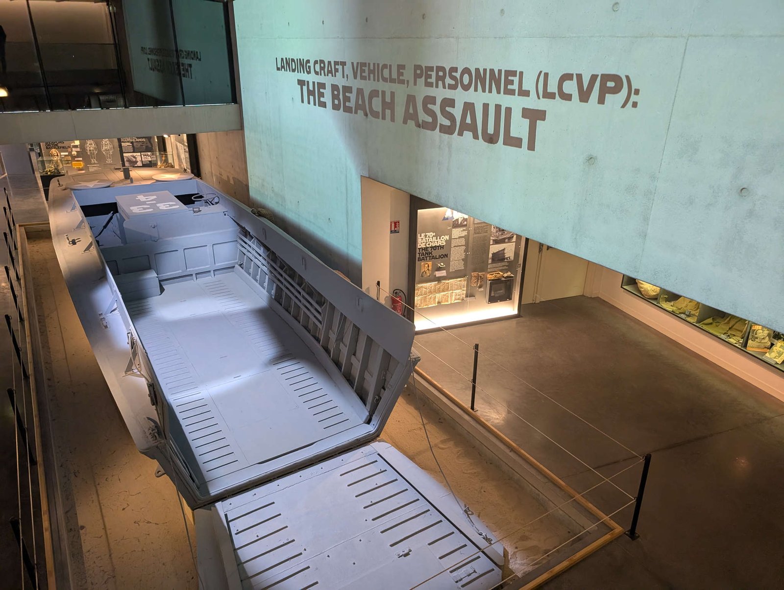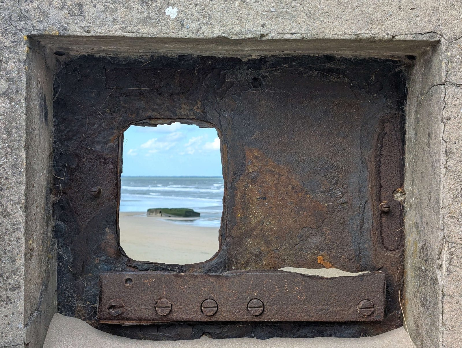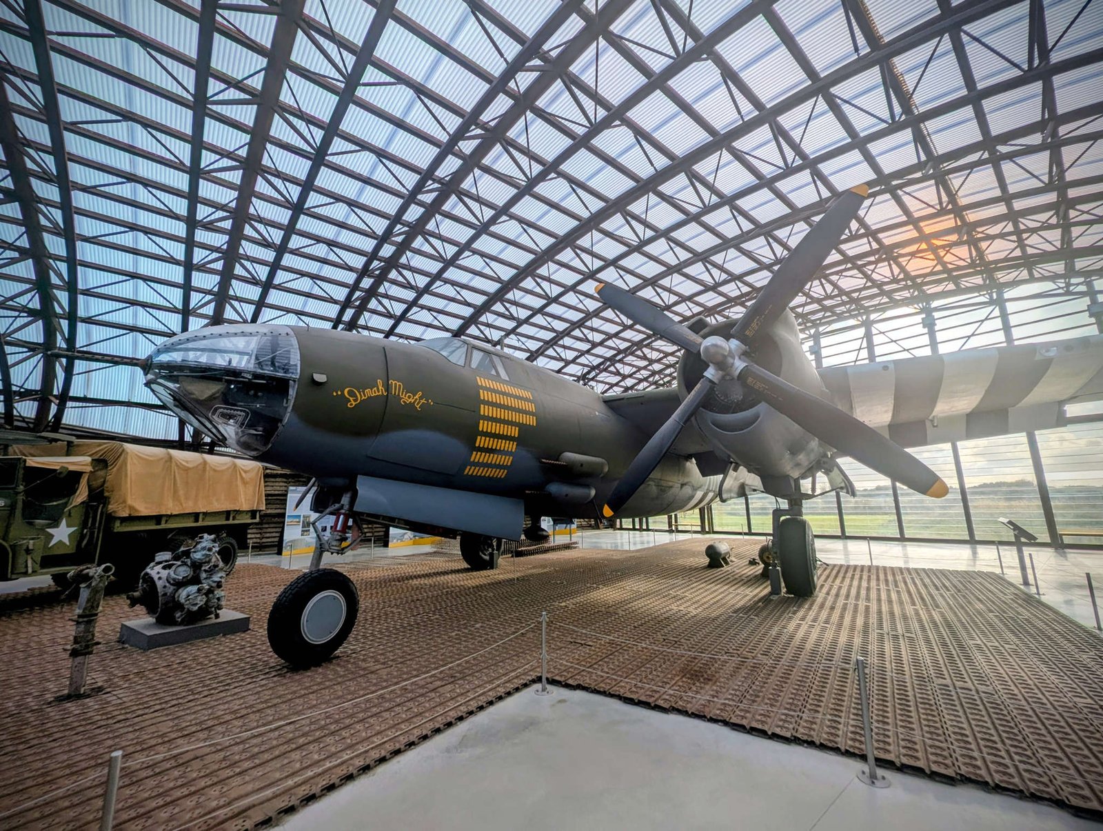 Después volvimos al coche y avanzamos apenas unos minutos hasta el Musée du Débarquement de Utah Beach. Yo me quedé en la cámper, vigilando que ninguna gaviota intentara colonizarme el cuenco. Papi entró al museo, que está justo donde desembarcaron las tropas. Dentro hay tanques, armas, uniformes y una historia muy detallada de cómo fue aquel día. También hay un bombardero B-26 enorme dentro del edificio, una peli inmersiva y paneles con nombres de soldados. Papi salió con cara de “ha estado bien, pero mi cerebro ya no absorbe más guerra por hoy”.