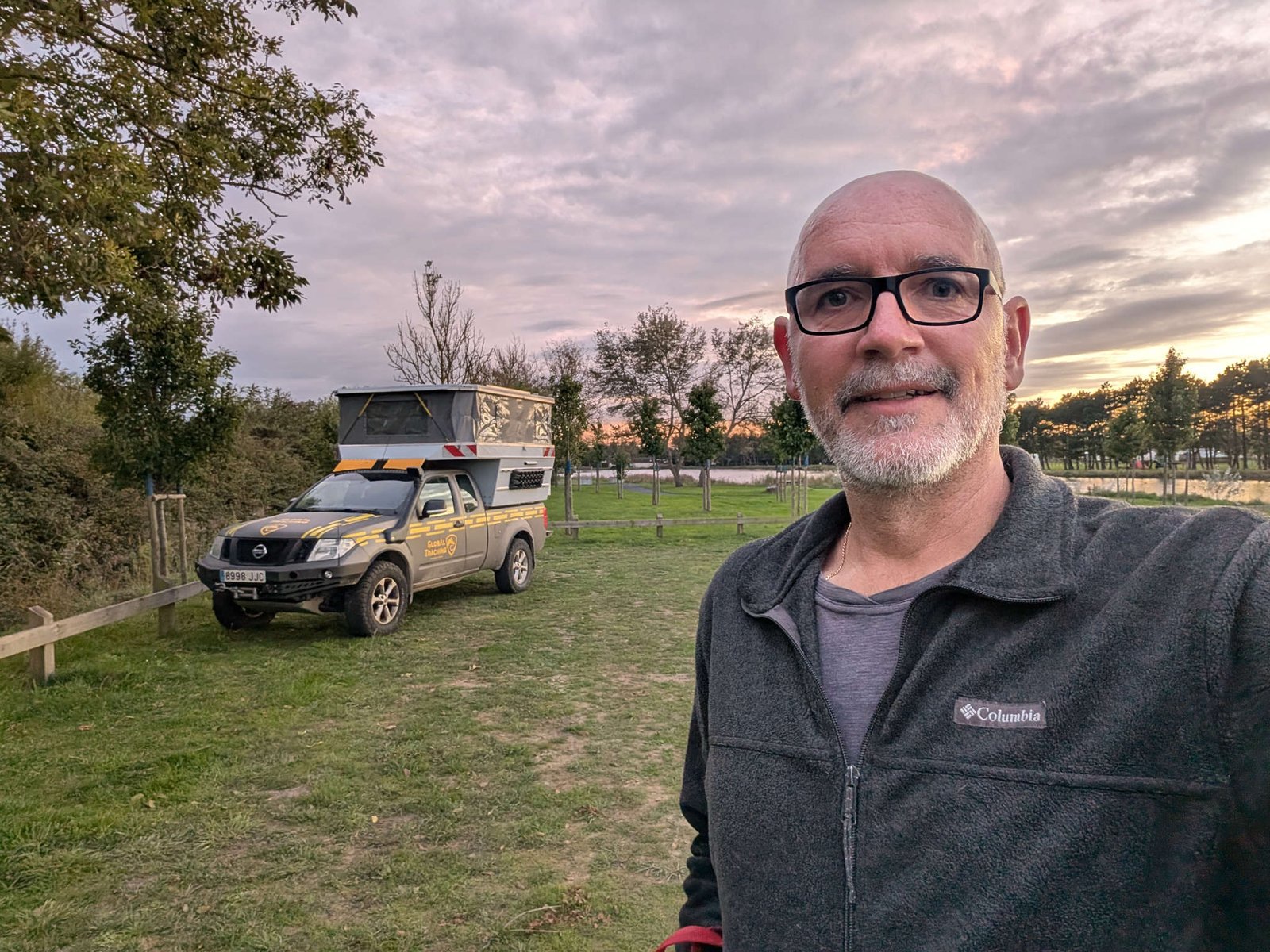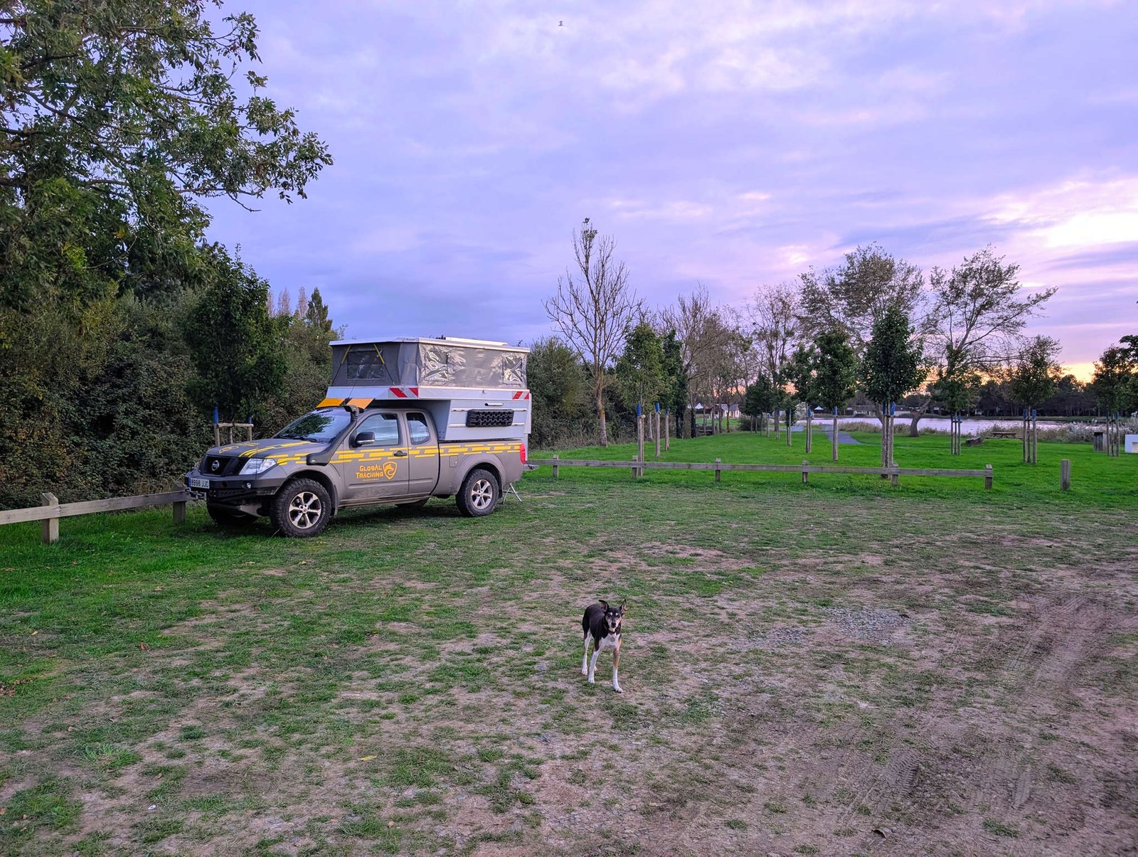 Pero a cincuenta metros había otro aparcamiento: un campo de césped junto a un parque, también en Park4Night. Y estaba completamente vacío. Ni coches, ni autocaravanas, ni humanos roncadores. Vistas al verde, suelo blandito y cero viento. Papi dijo “aquí nos plantamos” y yo adopté mi postura de guardián oficial del césped francés.