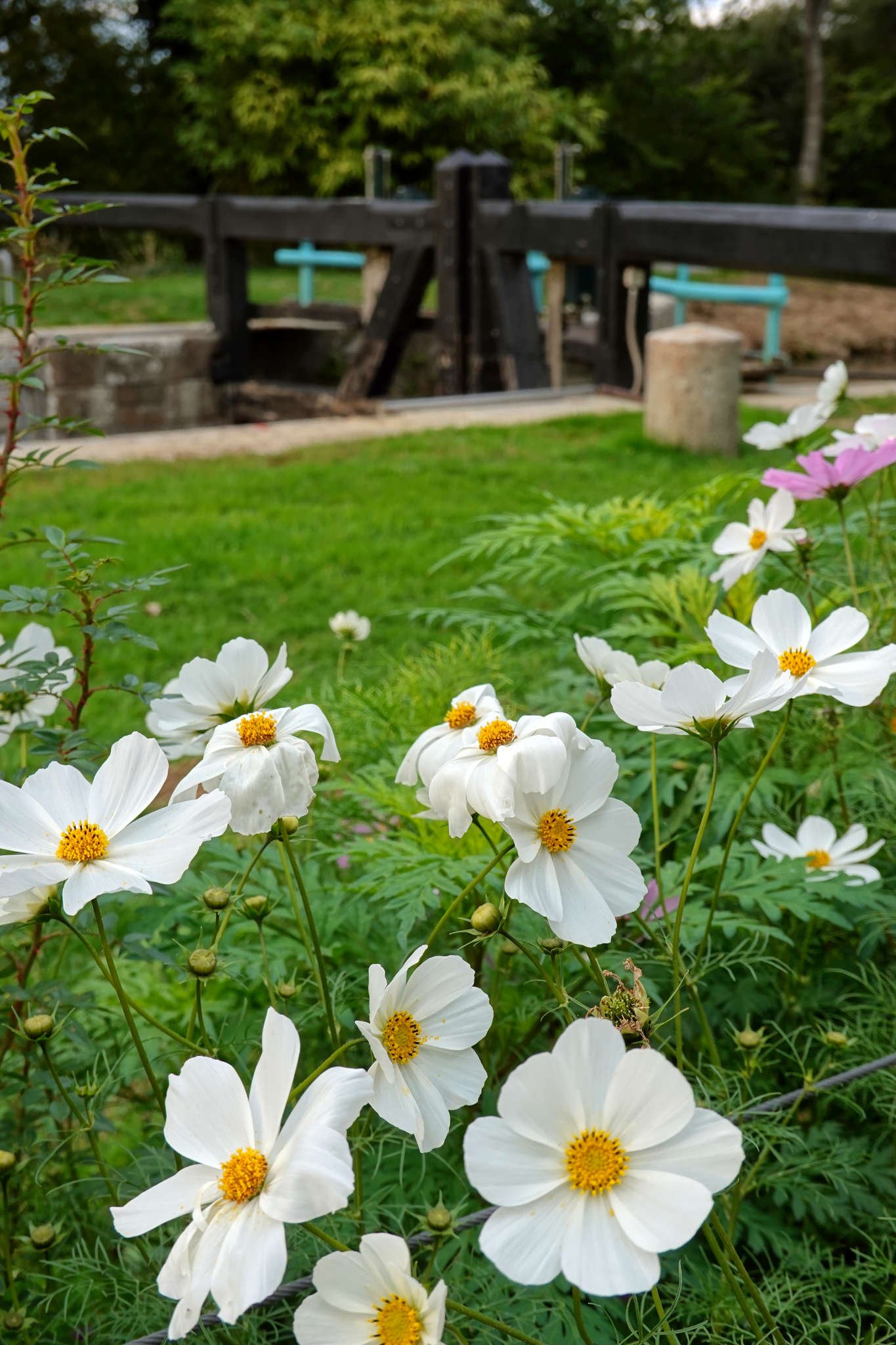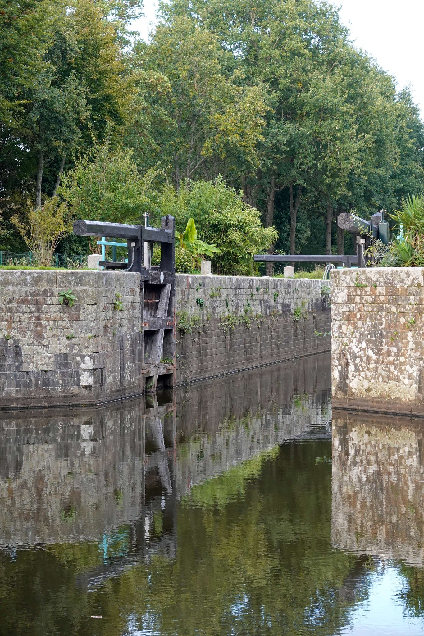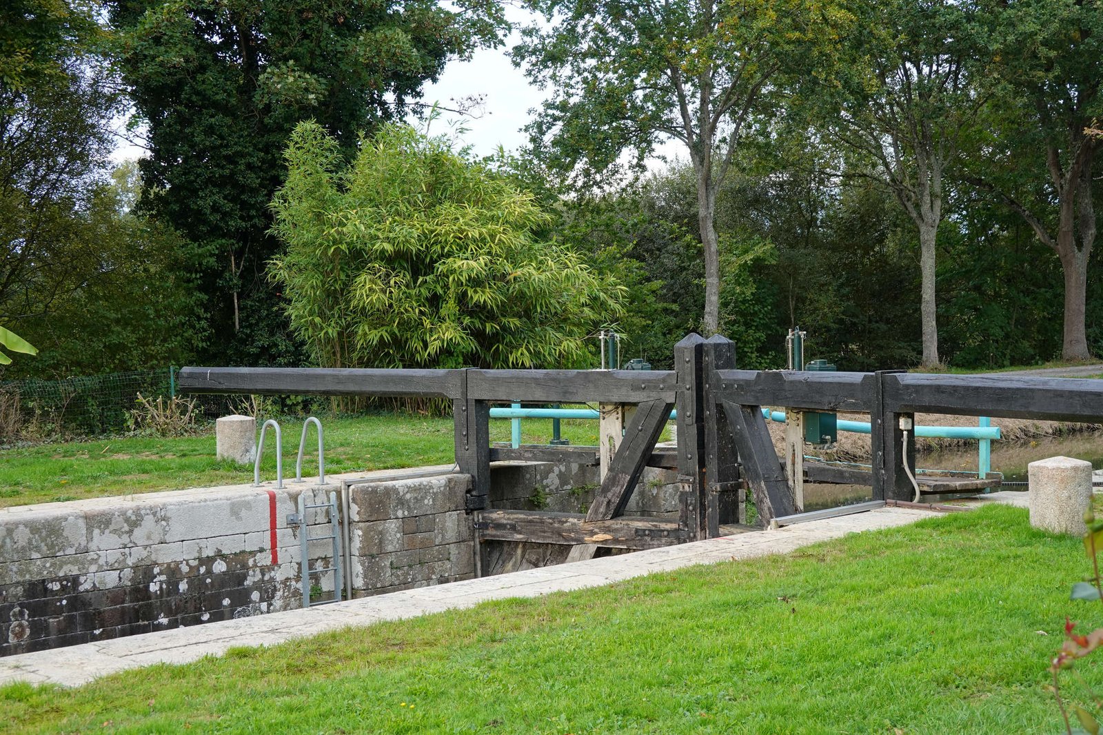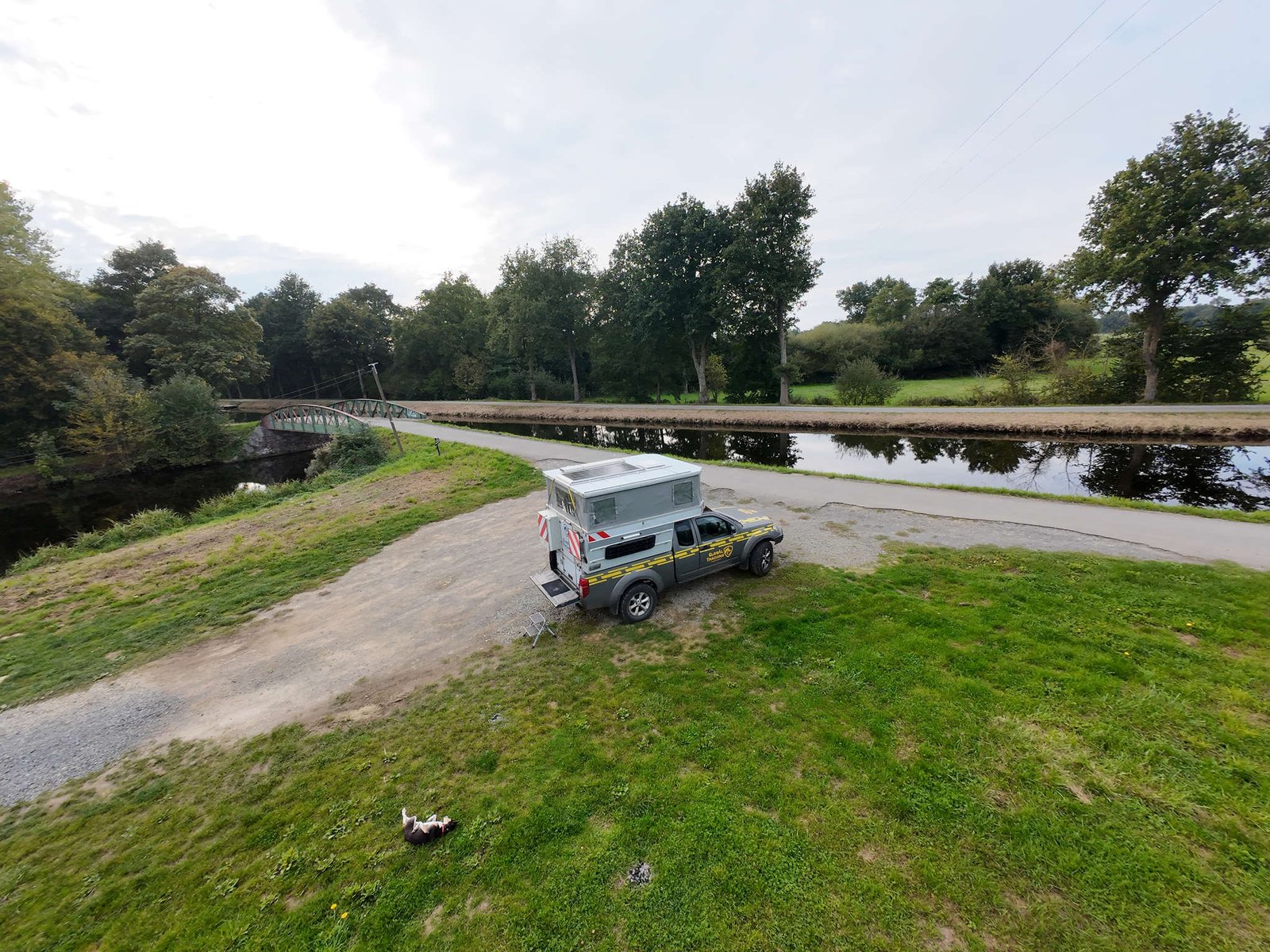 Pero sobre las seis decidió que era mejor acercarnos un poco más a Rennes, que queremos visitar mañana (si no nos distrae un queso o una rotonda). Abrimos Park4Night otra vez y encontramos un sitio curioso para dormir: en pleno campo, al lado de un canal y junto a una esclusa llamada *Écluse de la Charbonnière*. Las esclusas, para quien no tenga olfato náutico, son como ascensores de agua que suben y bajan barcos por los canales. Esta tiene casita antigua, compuertas de madera y aire de postal de otro siglo.