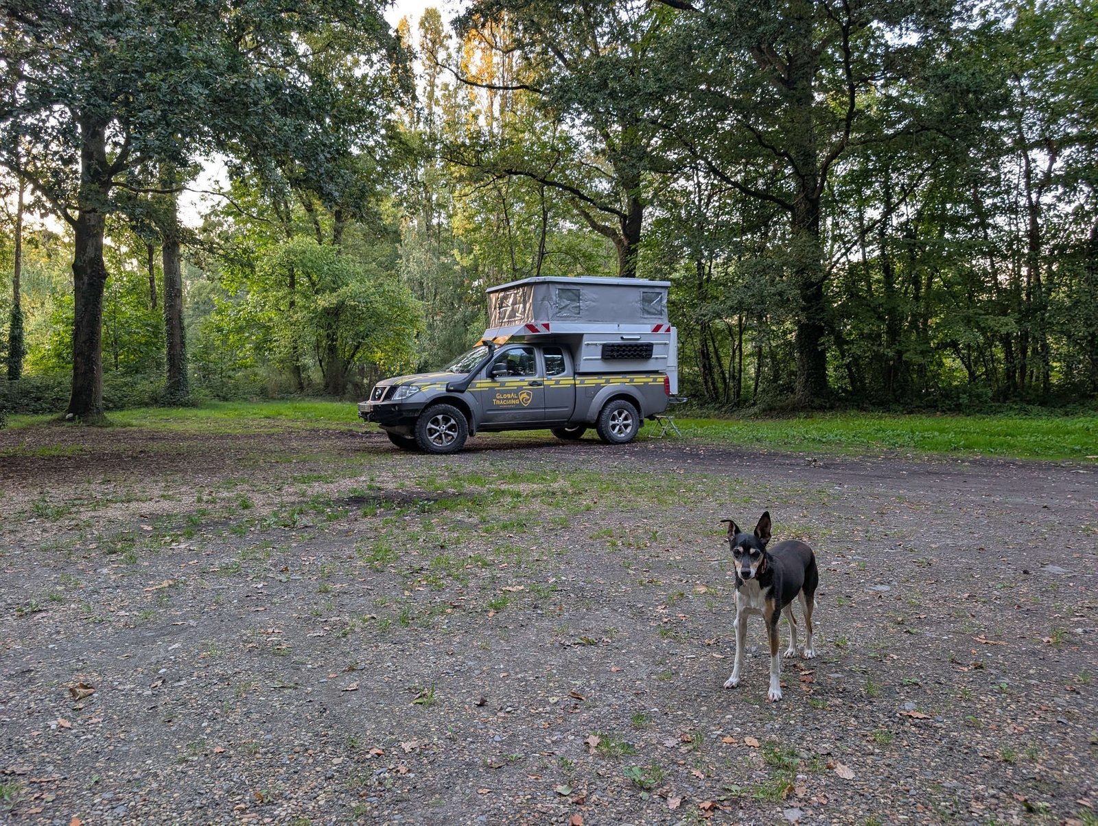 Un rato después llegamos al lugar elegido para dormir: un bosque de robles junto a unos estanques de pesca. Estamos completamente solos, sin fiesteros ni coches, y el sitio huele a madera, musgo y calma. Solo hay una amenaza natural: las bellotas. Cuando caen del árbol y golpean el techo de la cámper suena como si nos dispararan con pistolas de perdigones. Cada vez que cae una, papi da un bote y yo ladro al cielo como si vinieran los invasores. Pero comparado con los discotequeros de anoche, esto es un spa auditivo.
