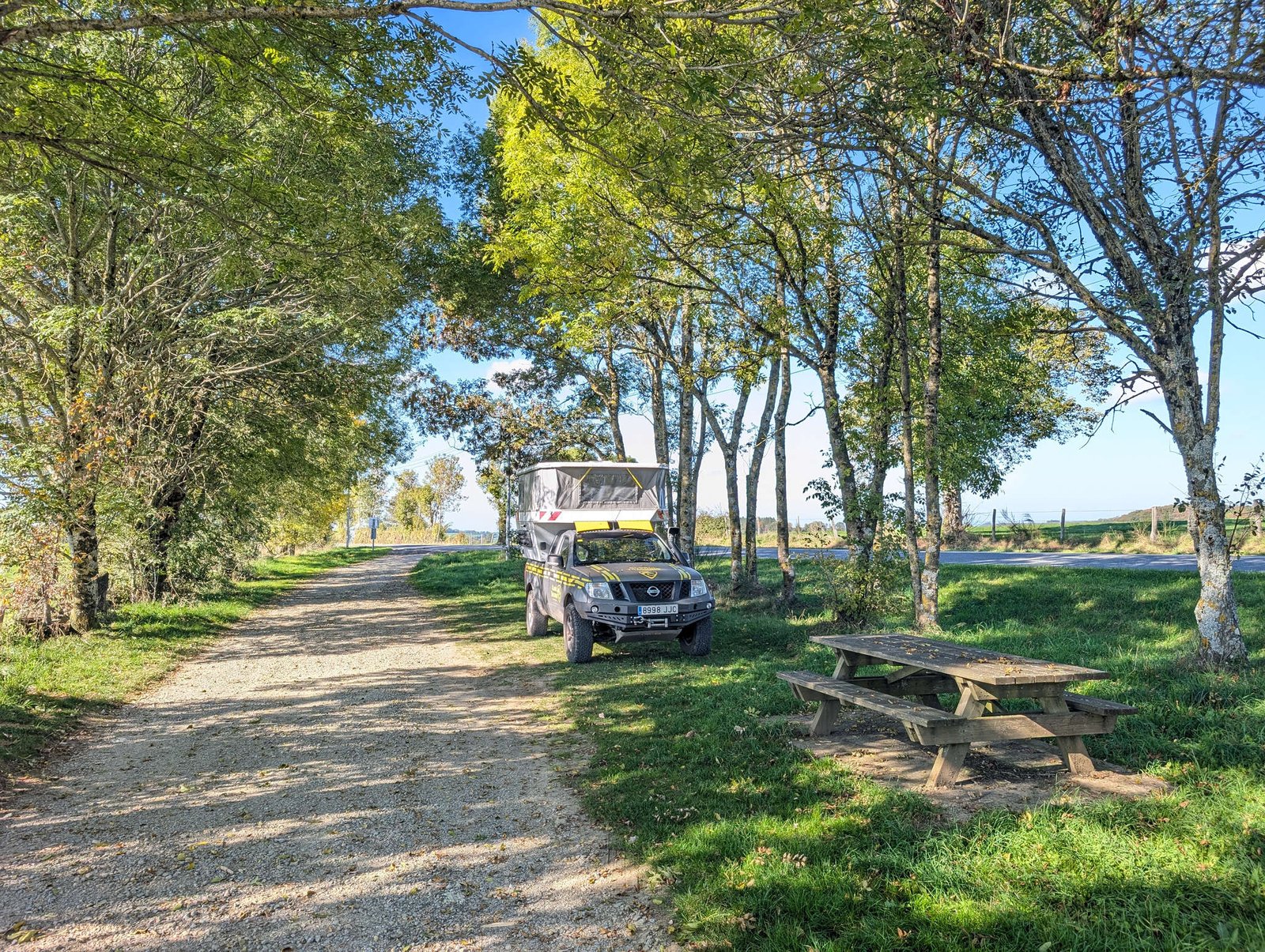Y ya casi de noche, zas: un área de picnic al lado de la carretera. “Sitio aceptable”, dijo papi, que es la versión humana de “bueno, vale”. Aparcamos, montamos base y cuando entramos en la camper resultó que el tráfico ya había muerto casi del todo, y el sitio no es tan feo como parecía desde lejos. Al final, silencio, algo de luna y olor a hierba fría. Final feliz, cama mullida y ronquidos sincronizados.