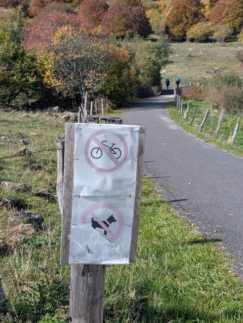 Todo fluía muy bien hasta que, después de unos tres kilómetros, ¡zas! Señales de prohibición: nada de perros, ni burros, ni caballos, ni bicis, ni unicornios. Solo humanos andando. Todo porque el camino cruza campos privados donde las vacas van por libre y no entienden de razas ni buenas intenciones. La ruta alternativa: asfalto y cara de resignación. Pues vale.