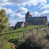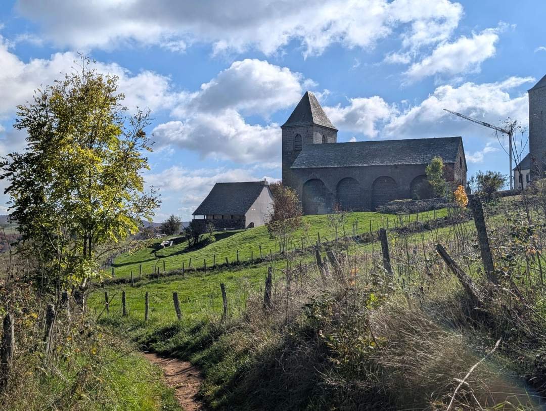 Después de unas dos horas llegamos a Aubrac. El pueblo es raruno: cuatro edificios enormes que parecen albergues, restaurantes o monasterios de montaña, pero casi todo cerrado menos el albergue oficial. Papi entró en la iglesia (yo vigilando la puerta, como buen portero canino) y luego comimos en un banco: él sandwiches, yo pienso tuneado con paté gourmet de lata. Nivel Michelin.