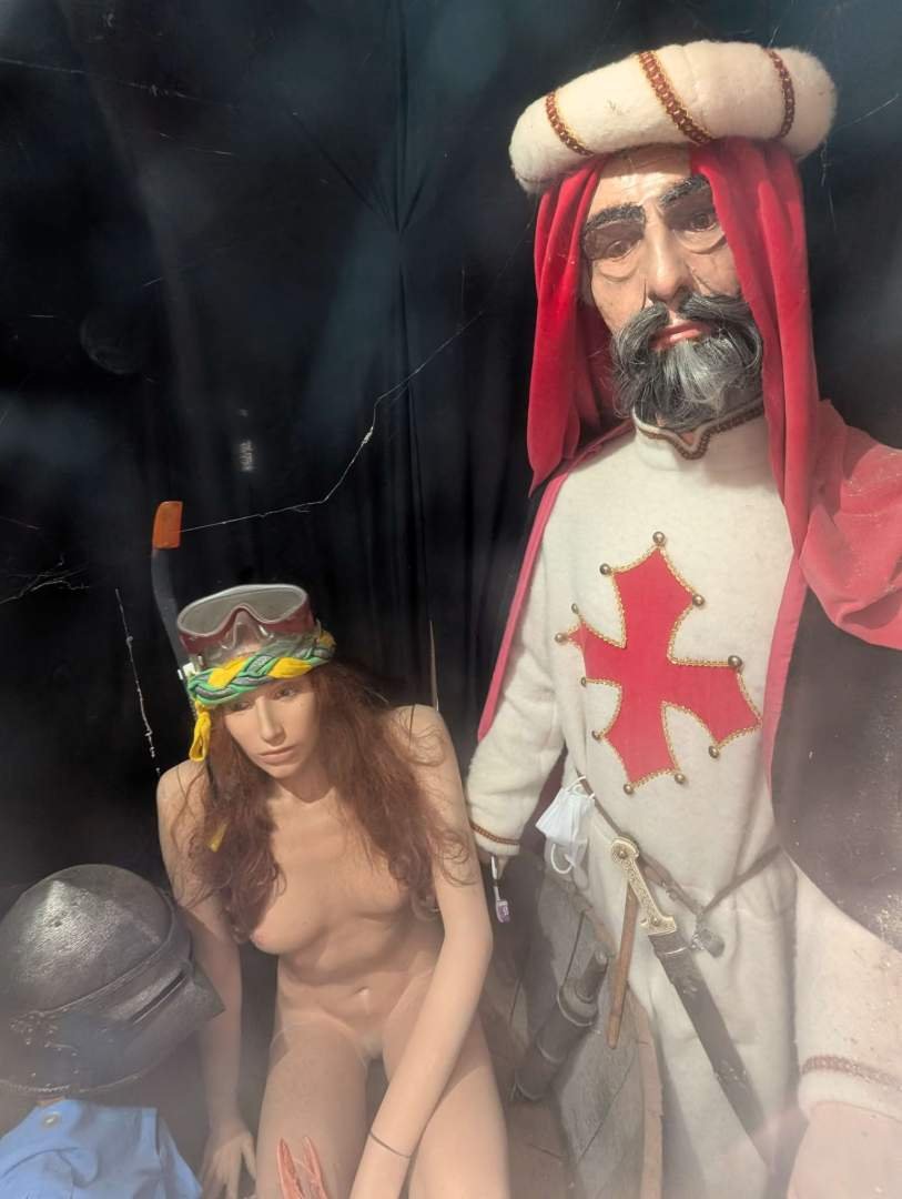Y de pronto, ¡zas!, el deyavú se materializó: en un escaparate cubierto de polvo y telarañas, dos maniquíes congelados en una escena imposible —una dama desnuda y un caballero medieval con cara de domingo—. Papi Edu se quedó mirando como si hubiese visto un fantasma. Sacó el móvil, rebuscó en el mi blog y… efectivamente: habíamos estado aquí el año pasado. Yo, que tengo olfato para esas cosas, ya lo sabía.