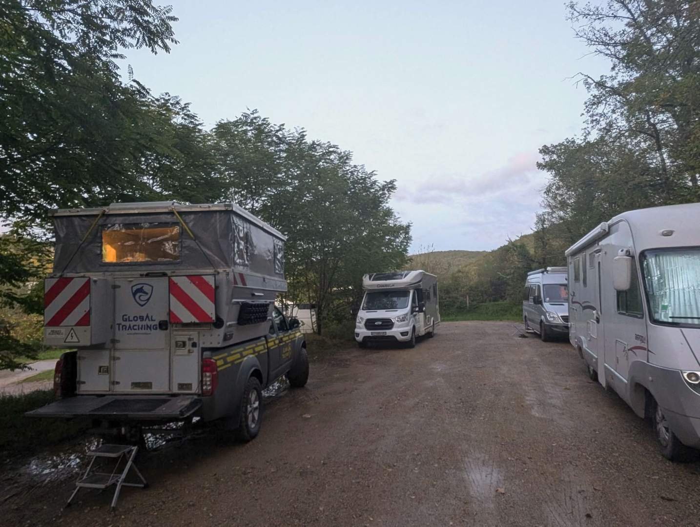 De vuelta al coche, justo cuando las primeras gotas volvieron a caer, arrancamos hacia Bruniquel. Una hora de curvas, colinas y lluvia intermitente, y llegamos al área de autocaravanas. Cuatro o cinco vehículos más, todos con sus humanos escondidos dentro, escuchando la lluvia golpear el techo. Papi Edu preparó la comida, y mientras el vapor empañaba los cristales, yo me acurruqué en mi manta favorita.