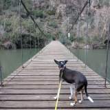 We liepen over loopbruggen die over de rivier hingen. Ik, natuurlijk, in de armen van papa Edu, want die stalen roosterbodem is niet geschikt voor mijn pootjes! We passeerden een hangbrug over de rivier de Segre (pont penjant del Congost del Mu), die zo lang was dat ik dacht dat hij voor enorme berggeiten was... maar hij werkte ook voor ons.