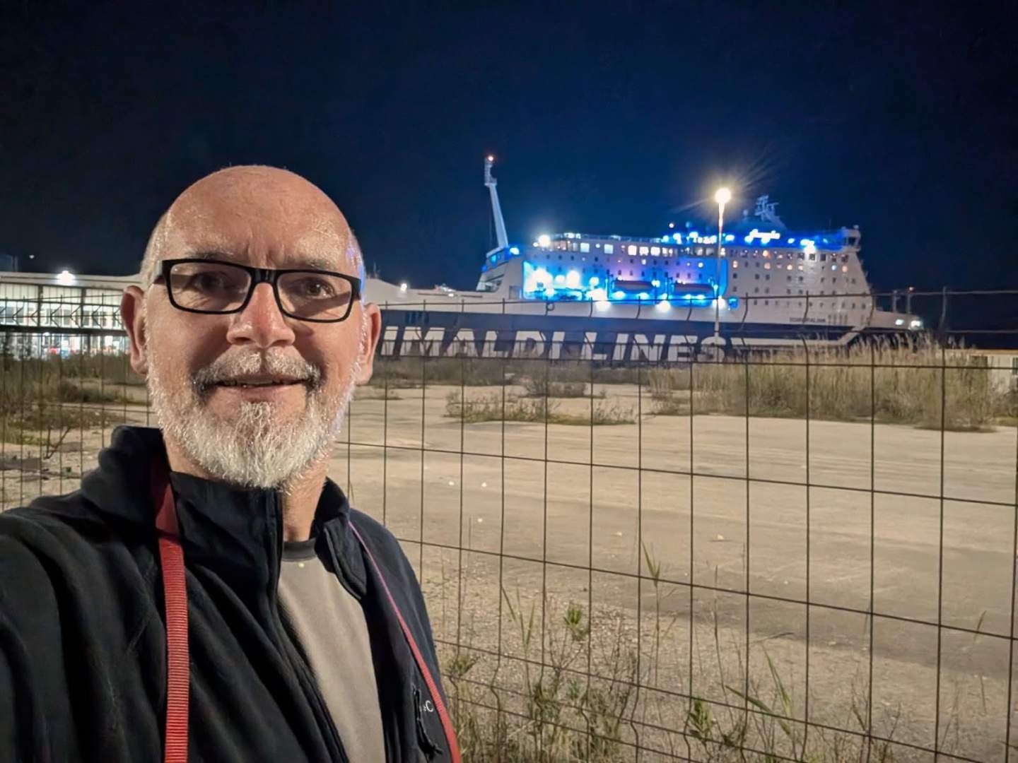 Después de la puesta del sol salimos hacia Brindisi y en media hora estábamos en el puerto. Check-in hecho y luego a esperar, más o menos una hora, hasta poder entrar. Mientras tanto, Papi Edu se puso a hablar con un griego que vive en Holanda y hablaba holandés perfecto. Yo me fijé más en sus dos perros salchicha. Me quedé a una distancia prudente, porque eran pequeños pero tenían pinta de tener más carácter que tamaño, como los jefes de obra.