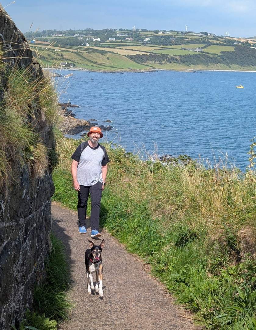 We vertrokken rustig, zoals altijd. Jullie weten het, onze motor heeft geen turbo... onze ochtenden worden direct zonder haast uit de fabriek geleverd. In ongeveer vijfentwintig minuten arriveerden we in Whitehead, parkeerden we en gingen op weg naar de Blackhead Lighthouse. Die vuurtoren hangt hoog op de kliffen alsof hij op wacht staat en ervoor zorgt dat geen enkel schip verdwaalt. Papi Edu en ik hadden daar een paar weken geleden al gewandeld met oom Joan, maar voor oom Javi was het een wereldpremière. Ik kende elke steen van de weg al, maar deed alsof ik verrast was om de opwinding niet te bederven. "Oh, wat een ongelooflijk uitzicht!", blafte ik met een gezicht van een beginnende toerist.