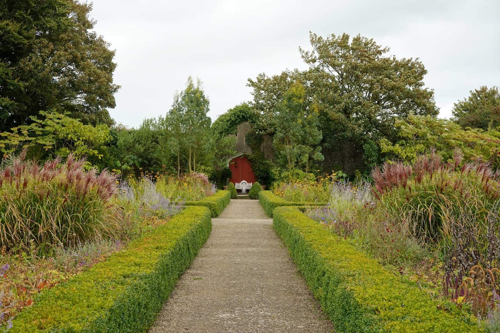 Achter het kasteel liggen de tuinen, onberispelijk. Rechte paden, goed onderhouden bloemen en die sfeer van een plek die nog steeds klopt ondanks de ruïnes. We brachten er meer dan een half uur door, ruikend aan elke hoek (zij met hun ogen, ik met mijn neus), tot we terugkeerden naar de auto.